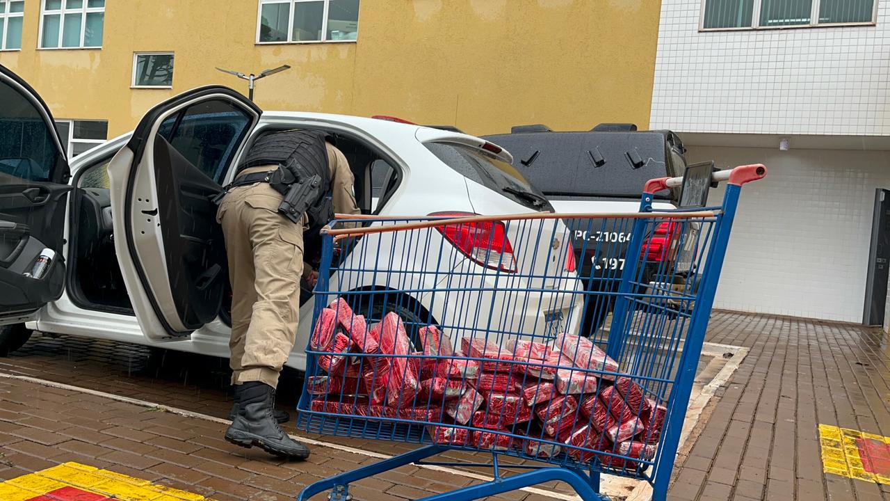 O carro, modelo Onix, é de locadora e foi pego em Foz do Iguaçu carregado com 159 kg de maconha. O motorista levaria a droga até as proximidades de Curitiba, a mais de 500 km de distância. A PM também encontrou no carro 30 ampolas de tizerpatida, o popular Moujaro. O condutor quebrou o celular no momento da abordagem da Polícia Militar.