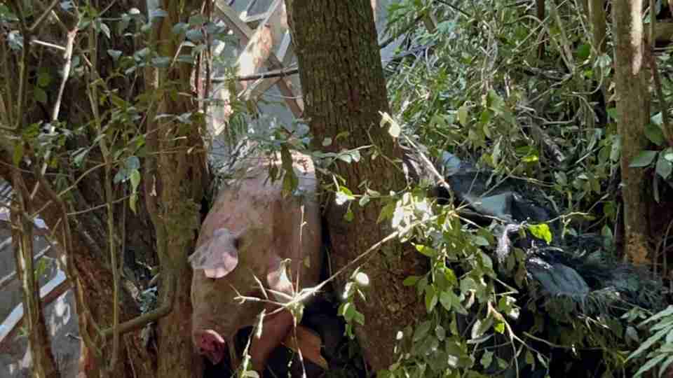 Caminhão com porcos tomba em ribanceira no interior de Cascavel