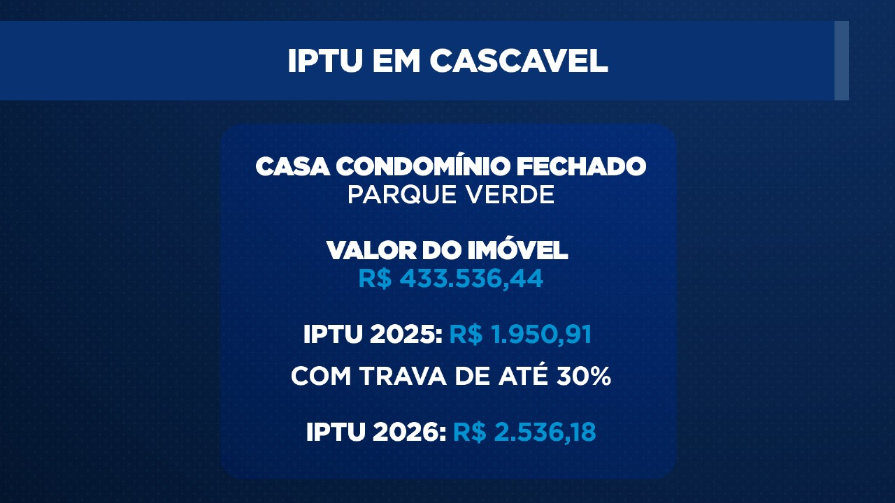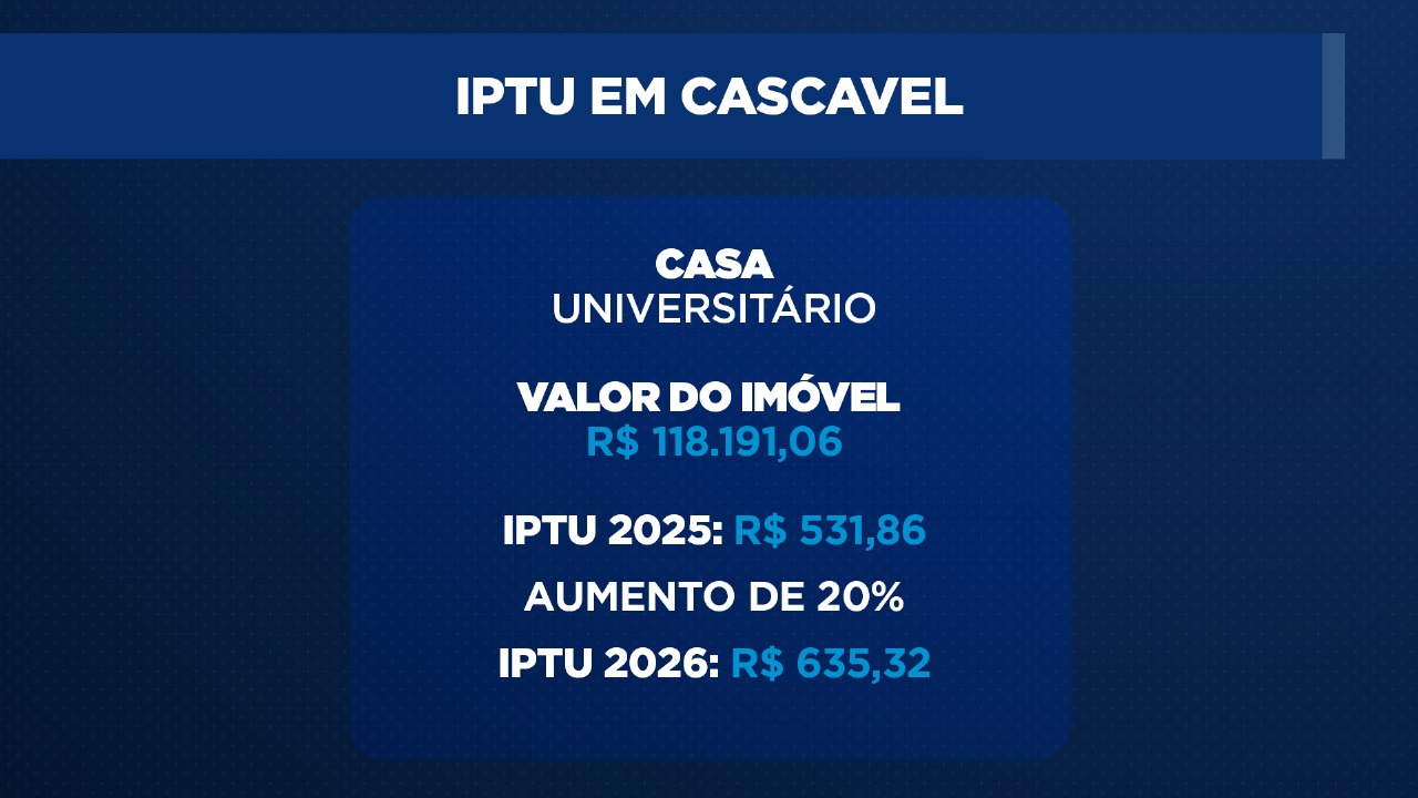 O Imposto Predial e Territorial Urbano (IPTU) vai ficar mais caro em Cascavel, a partir de 2026. O município confirmou que haverá reajuste. Na média geral, o aumento será de 20% sobre o valor final do imóvel e não pode ultrapassar 30%.