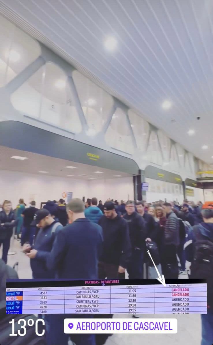 A Gol também cancelou um voo que deveria partir de São Paulo e pousar em Cascavel (PR), às 10h50. Uma aeronave da Azul, que vinha de Curitiba (PR) e deveria chegar em Cascavel às 11h20, está atrasada.