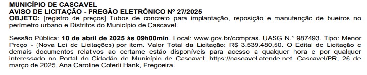 O edital completo e mais informações podem ser consultadas no Portal do Cidadão de Cascavel.