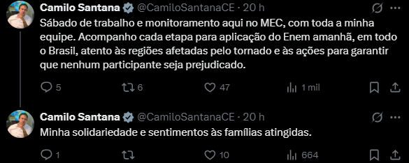 "Acompanho cada etapa para aplicação do Enem amanhã, em todo o Brasil, atento às regiões afetadas pelo tornado e às ações para garantir que nenhum participante seja prejudicado.", escreveu o ministro em publicação no X.