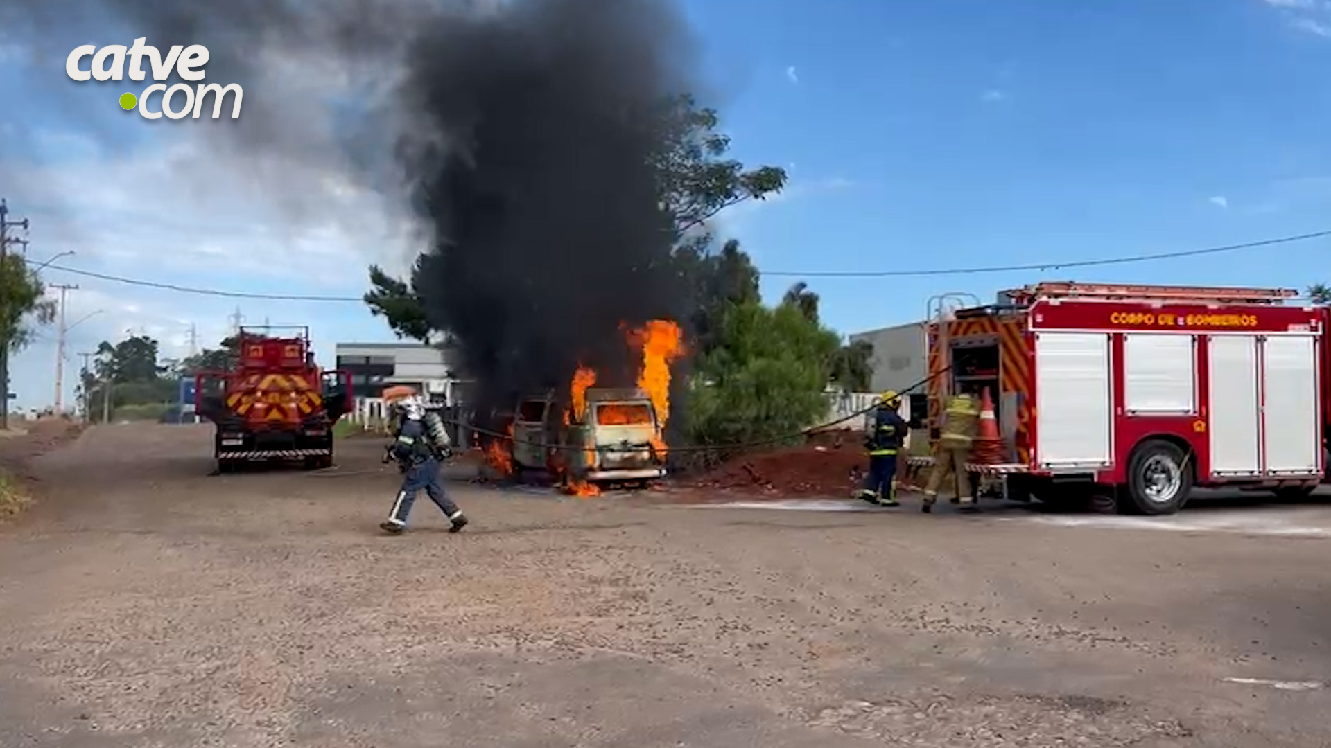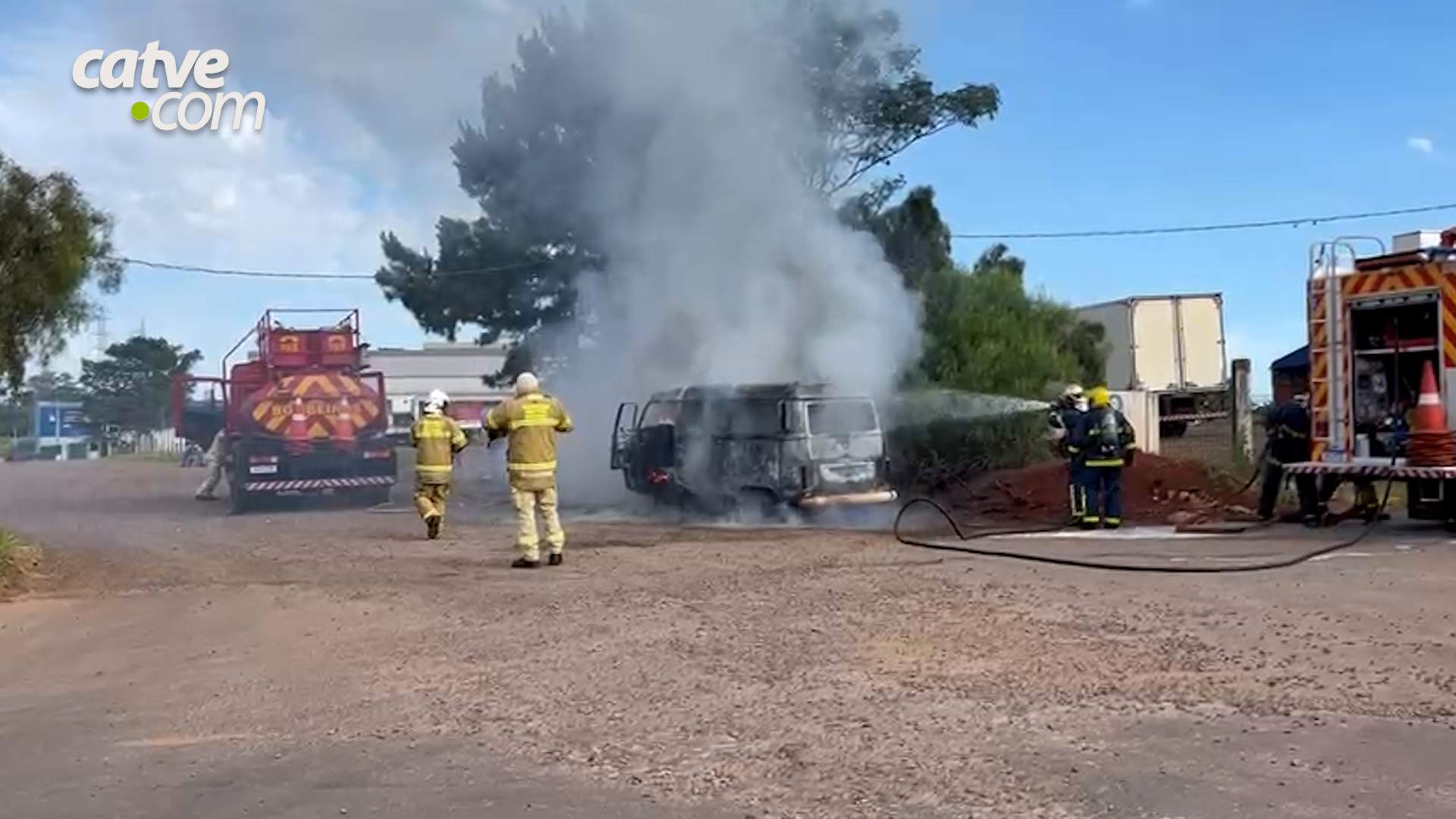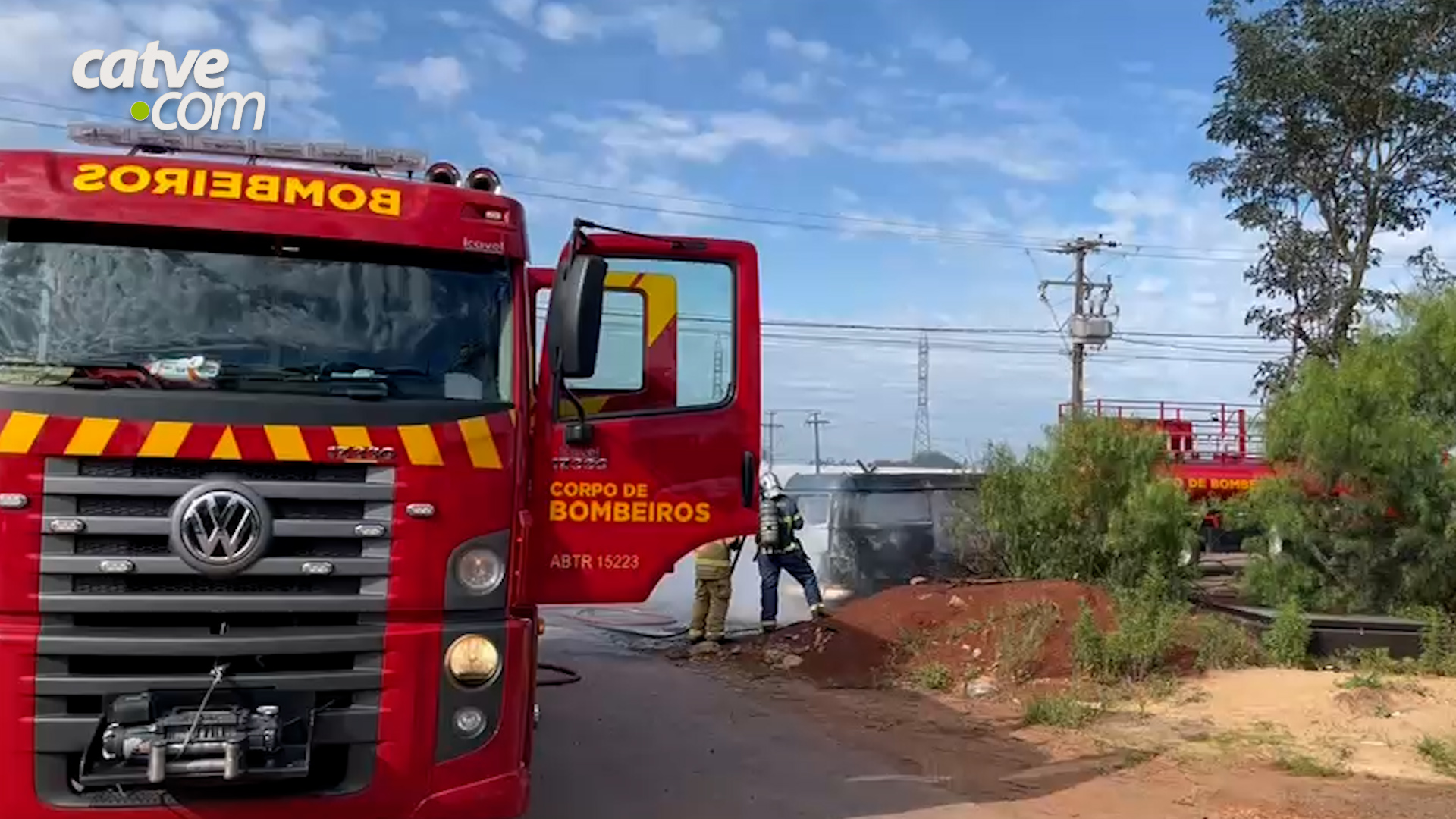 Uma Volkswagen Kombi foi completamente destruída por incêndio na marginal da BR-467, em Cascavel, no Oeste do Paraná, na manhã desta quarta-feira (12).