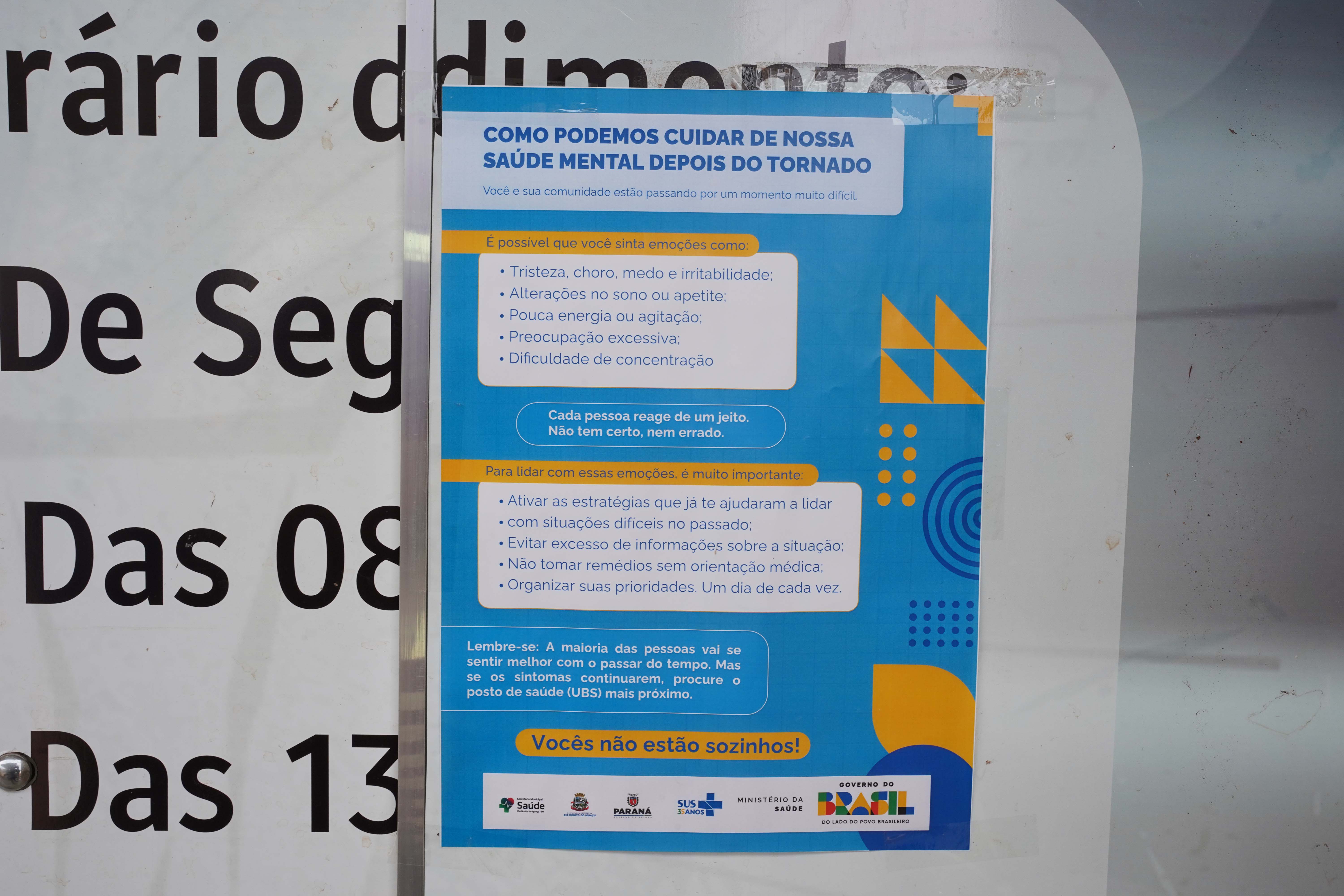 Equipes de saúde seguem em Rio Bonito do Iguaçu, no Centro-Sul do Paraná, para garantir atendimento psicossocial às vítimas do tornado que devastou o município na última sexta-feira (7). Desde domingo (9), cerca de 300 moradores e famílias afetadas receberam acolhida, orientações e acompanhamento individual ou em grupo.