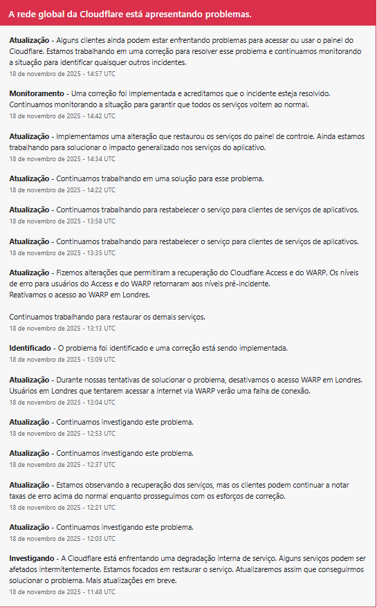 No site oficial, a Cloudflare informou que a rede global enfrentava falhas. Às 08h48, a empresa registrou degradação interna de serviço e relatou falhas intermitentes. Atualizações posteriores, às 09h03, 09h21, 09h37 e 09h53 do horário local, indicaram que a equipe seguia com a investigação e observava sinais de recuperação, embora as taxas de erro continuassem acima do normal.