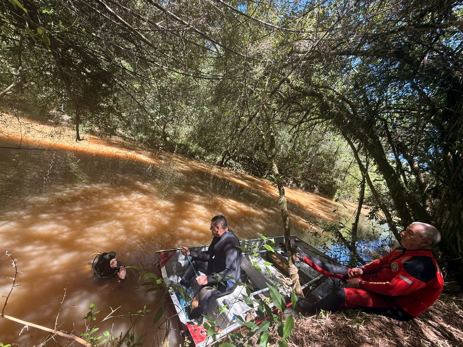 A equipe do Corpo de Bombeiro foi mobilizada para localizar a vítima que estava desaparecida. O homem estava pescando com três amigos, quando caiu na água, submergiu e não foi mais visto.