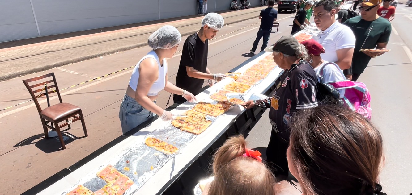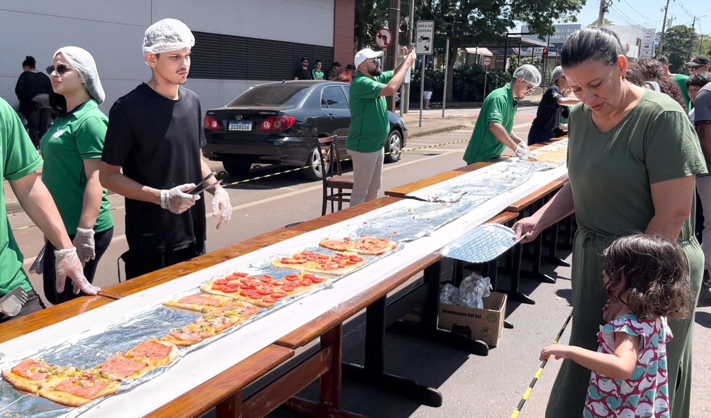 Uma pizza de 74 metros foi servida na manhã deste domingo (23), em Cascavel. A ação realizada na rua Erechim, nº 1015, faz parte das comemorações do aniversário de 74 anos da cidade.