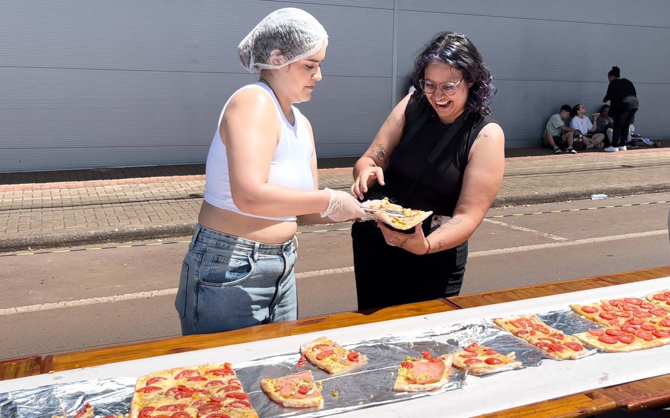 Ao todo, 1.500 fichas estavam disponíveis e a distribuição das fatias estava prevista para começar às 10h30. A pizza foi montada e coberta até o início da entrega.