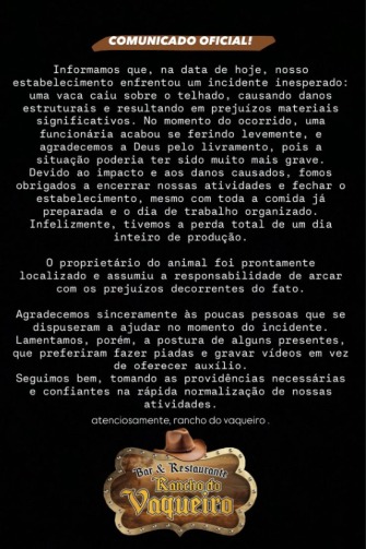 A equipe do Rancho do Vaqueiro também relatou que algumas pessoas que estavam próximas ajudaram no momento do fato.