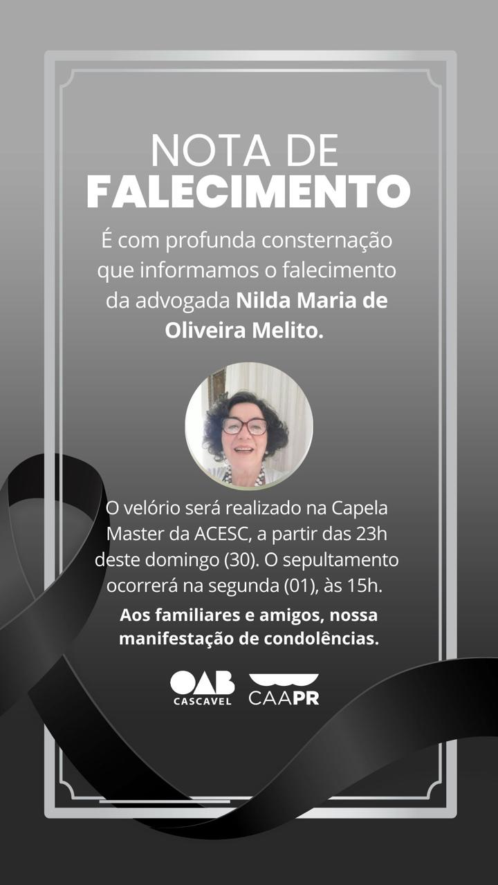 Familiares e amigos comunicam o falecimento da advogada Nilda Maria de Oliveira Melito aos 76 anos, neste domingo (30).