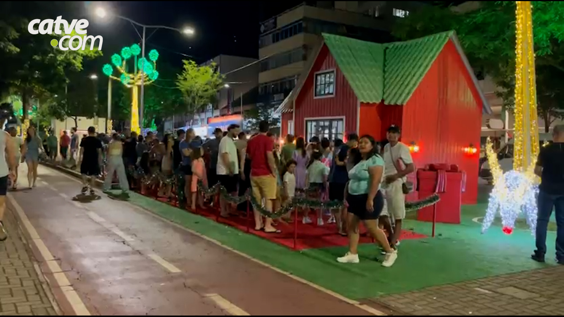 A noite deste domingo (30) foi marcada por um fluxo intenso de famílias que levaram seus pequenos para visitar a casinha do Papai Noel, no calçadão da Avenida Brasil. Desde a abertura no dia 15, o espaço vem recebendo visitantes diariamente. As crianças vão acompanhadas por pais, avós e responsáveis.