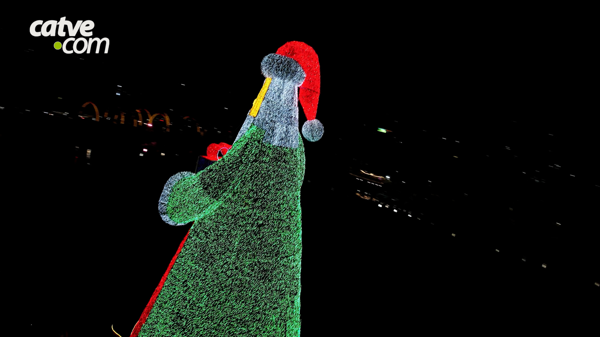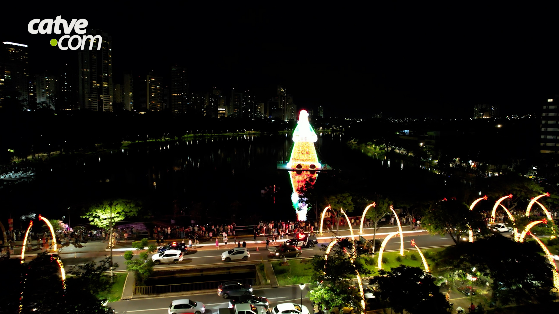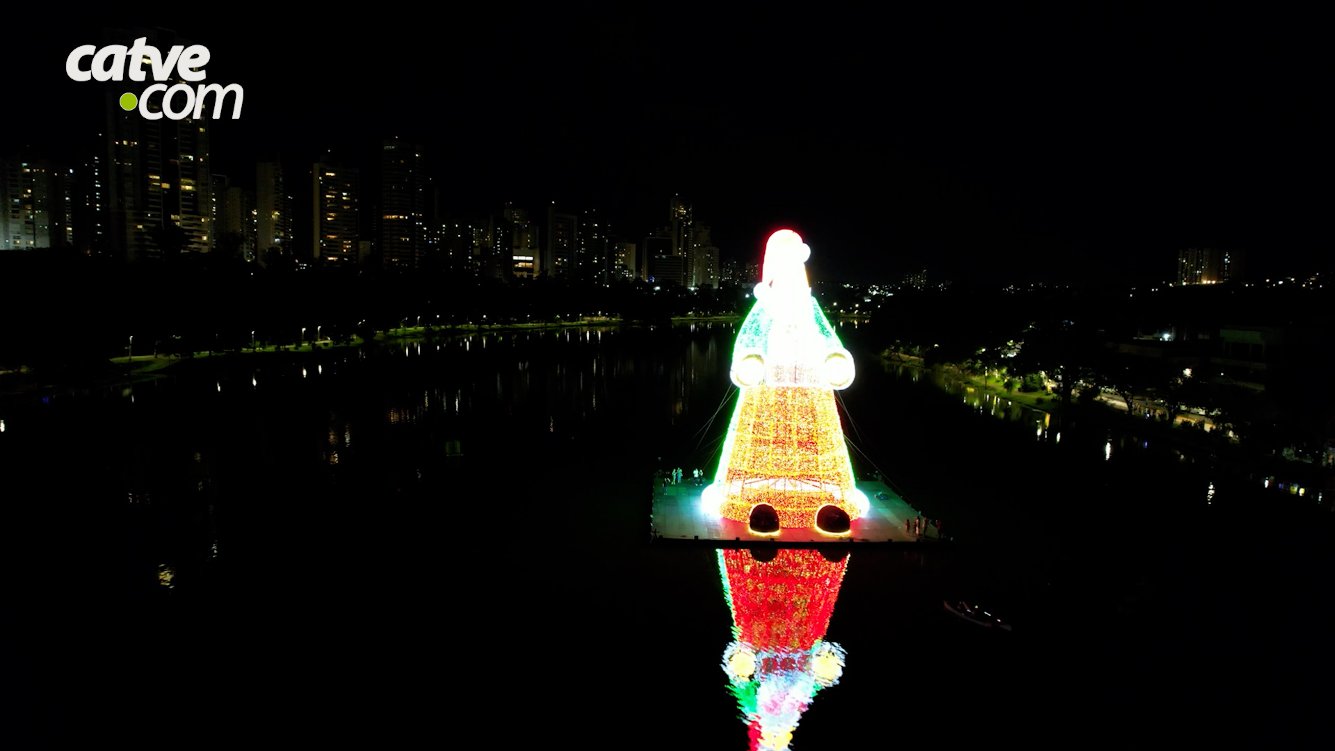 A figura monumental, que pesa 15 toneladas e reúne cerca de 450 mil lâmpadas de LED, foi oficialmente acesa no último domingo (30), durante cerimônia promovida pela Prefeitura de Londrina. O Papai Noel está montado sobre uma plataforma flutuante no Igapó 2, para onde foi transportado por balsa antes da ativação das luzes.