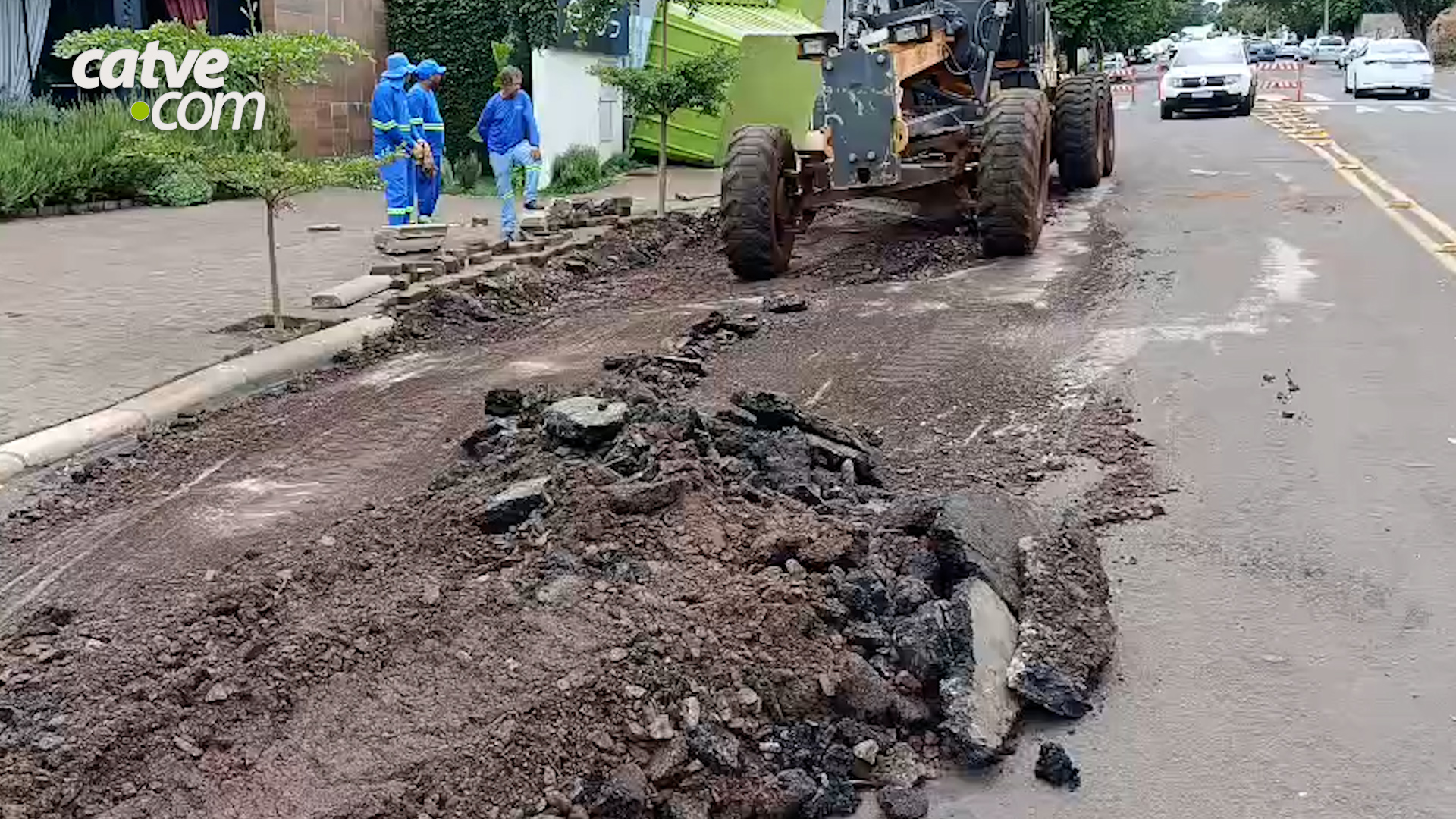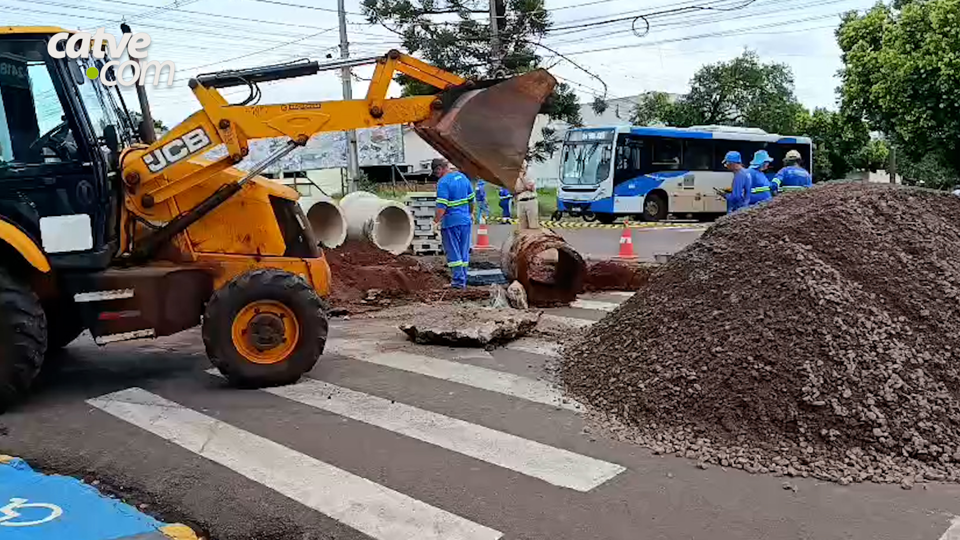 Os trabalhos tiveram início por volta das 9h e incluem a substituição da tubulação danificada, com uso de maquinário pesado. A intervenção ocorre no cruzamento da rua Senador Atílio Fontana com a rua Armando Luiz Arosi, na região central da cidade, e deve seguir até o final do dia. A recomposição da camada asfáltica está prevista para quarta-feira (17).