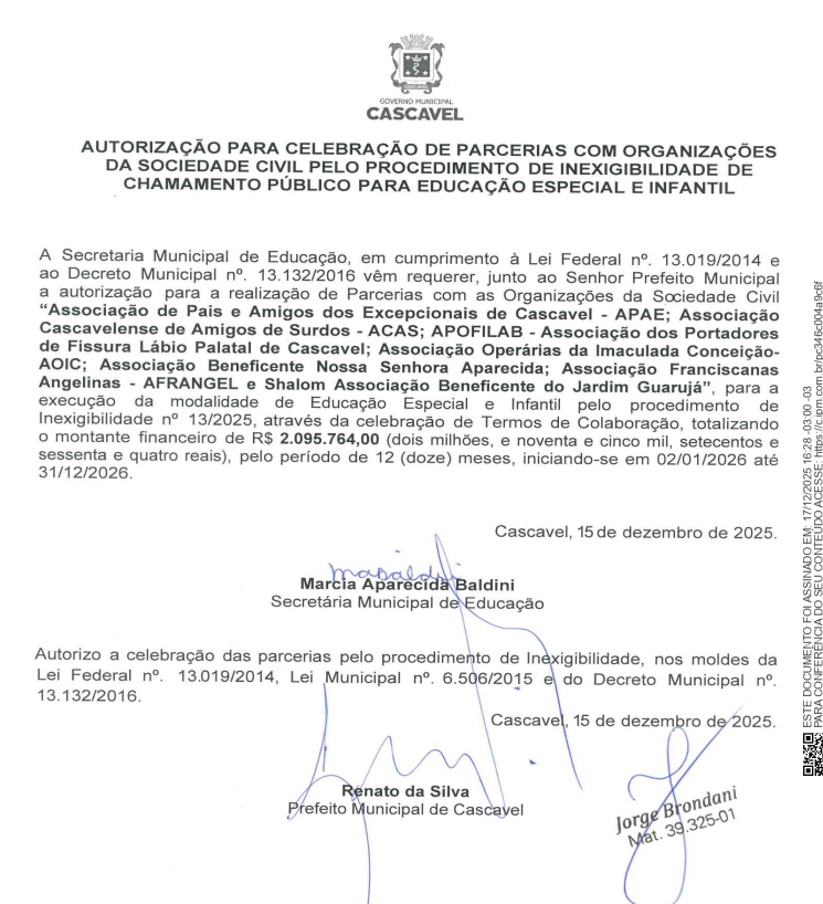 A autorização foi assinada pelo prefeito Renato Silva e pela secretária municipal de Educação, Márcia Aparecida Baldini, e prevê a formalização de parcerias sem chamamento público, conforme a legislação vigente. Os contratos terão duração de 12 meses, com vigência entre janeiro e dezembro de 2026.