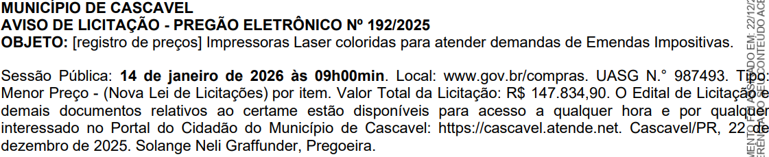 O Município de Cascavel lançou o pregão eletrônico nº 192/2025 para registro de preços visando a aquisição de impressoras laser coloridas. Os equipamentos devem atender demandas oriundas de emendas impositivas.