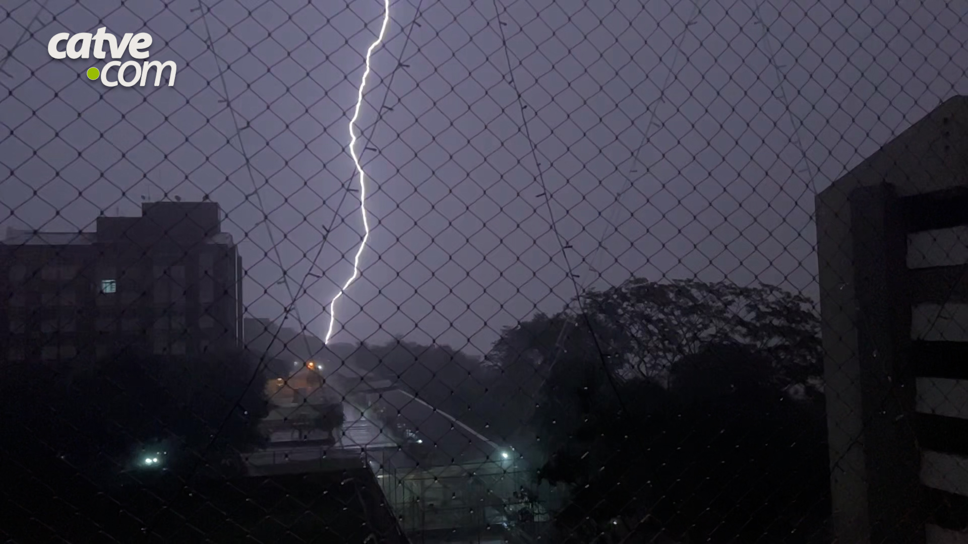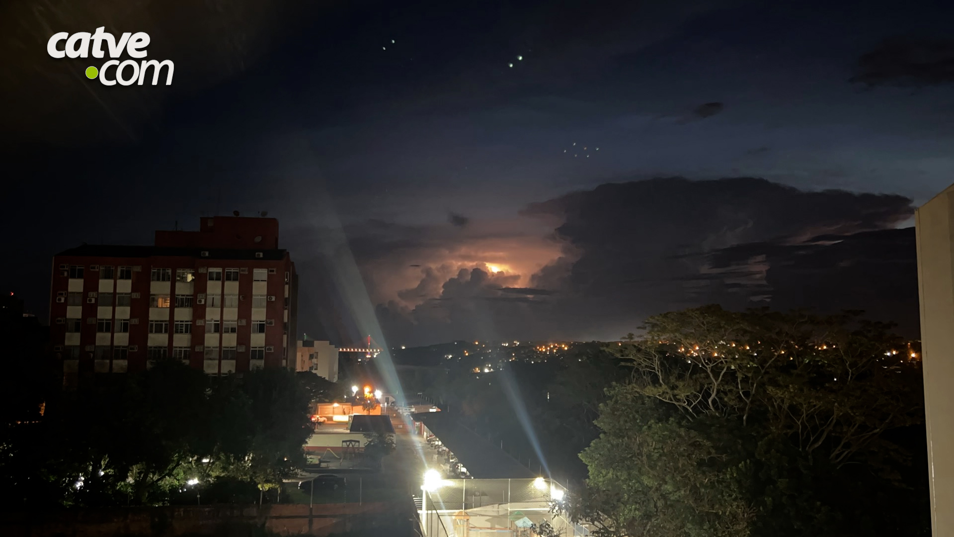 Outra gravação, feita já na madrugada desta segunda-feira (29), flagra o momento em que um raio corta o céu da cidade, evidenciando a intensidade da instabilidade climática.