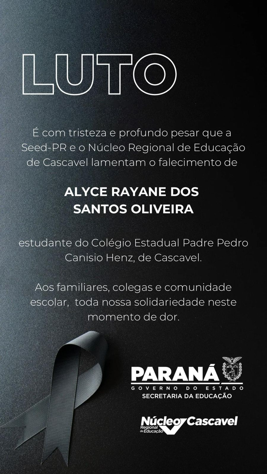 A Secretaria de Educação, através do Núcleo Regional de Educação de Cascavel, emitiu nota de pesar pela morte da adolescente Alyce Rayane dos Santos Oliveira.