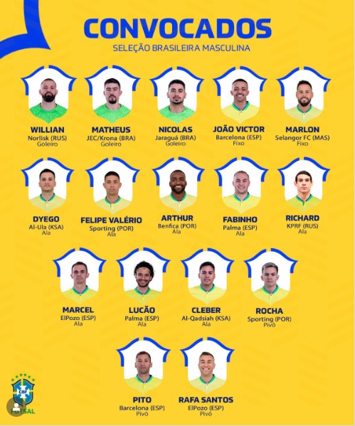 A Seleção Brasileira masculina de futsal está convocada para a Copa América de Futsal 2026, competição que será disputada em Assunção, no Paraguai, entre os dias 24 de janeiro e 1 de fevereiro. A lista foi divulgada pelo treinador Marquinhos Xavier nesta segunda-feira (29).