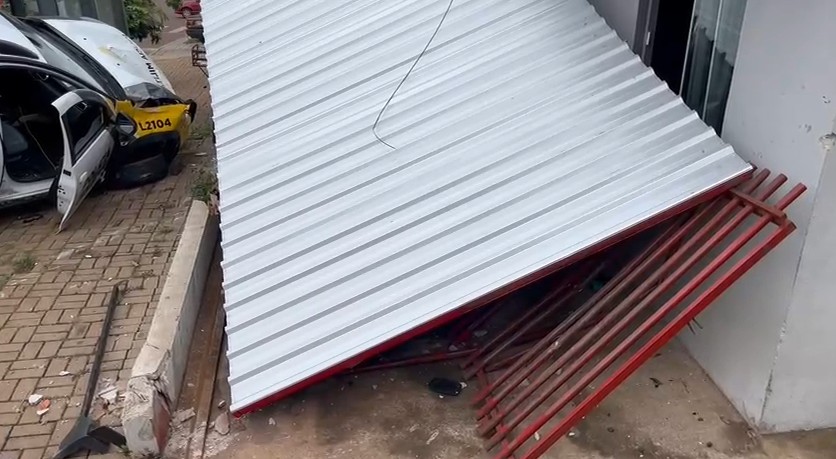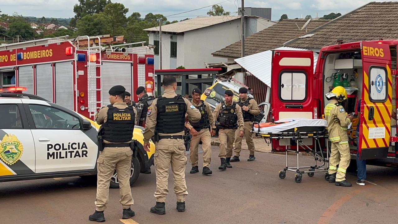 Uma viatura da Polícia Militar atingiu um carro, ponto de ônibus e a entrada de uma casa no bairro Interlagos em Cascavel, na tarde desta quinta-feira (13).