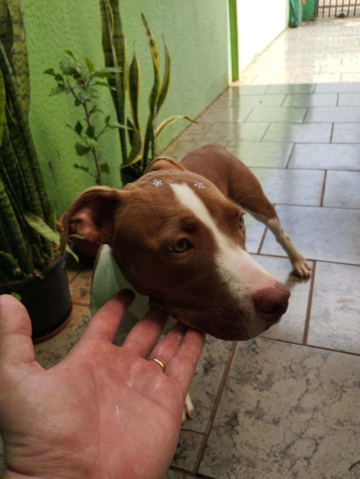 Internauta estava fazendo caminhada, quando o animal começou a segui-lo. A cadela aparenta ser um filhote, é dócil e está com adereços na região da cabeça, o que indica que ela pode ter um lar.