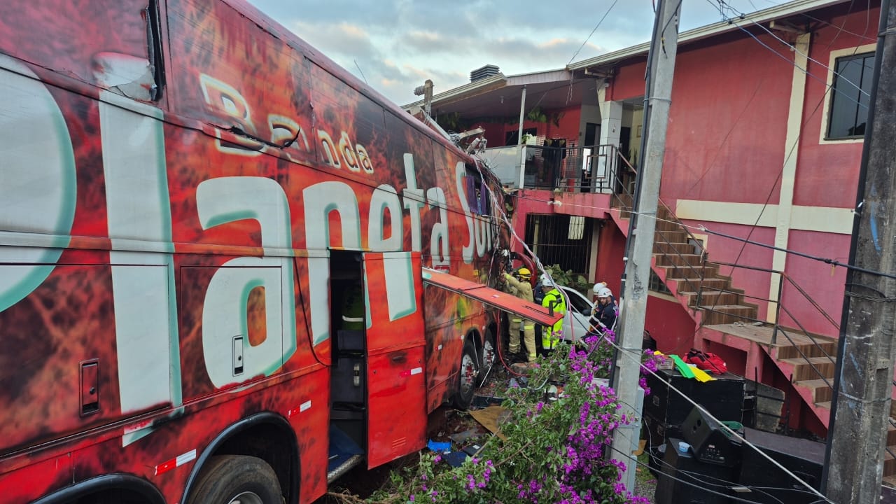 Com o impacto, o ônibus perdeu o controle, bateu em uma árvore, atingiu um carro e só parou ao bater contra casa. Os moradores dormiam quando o veículo invadiu a residência.