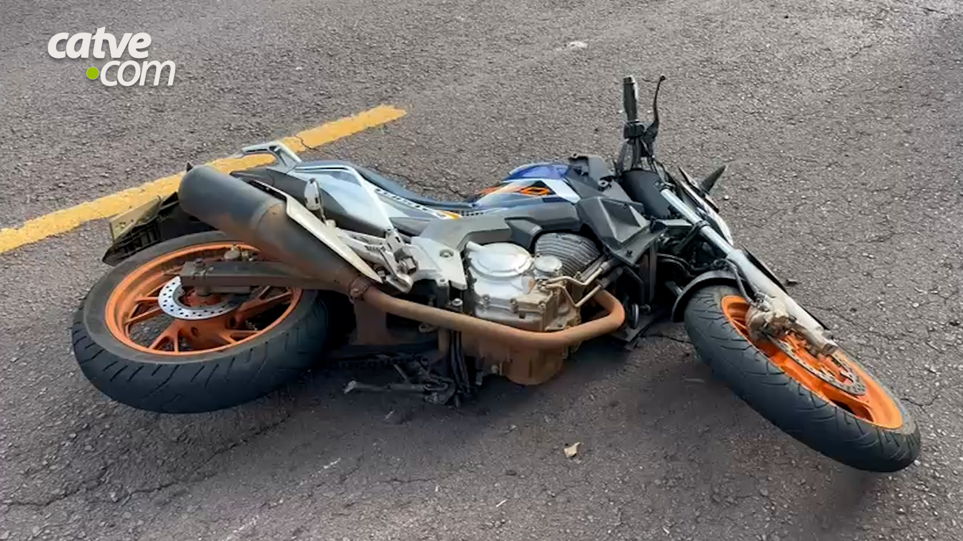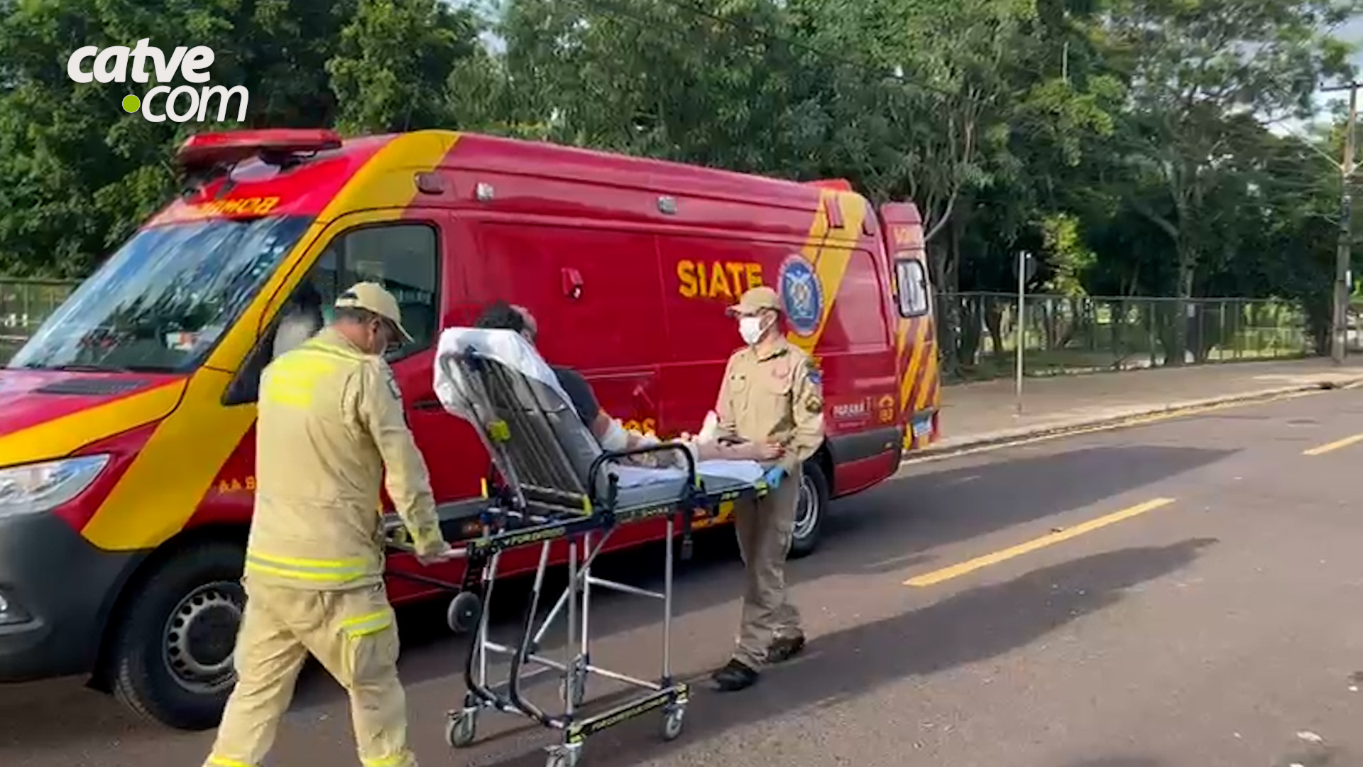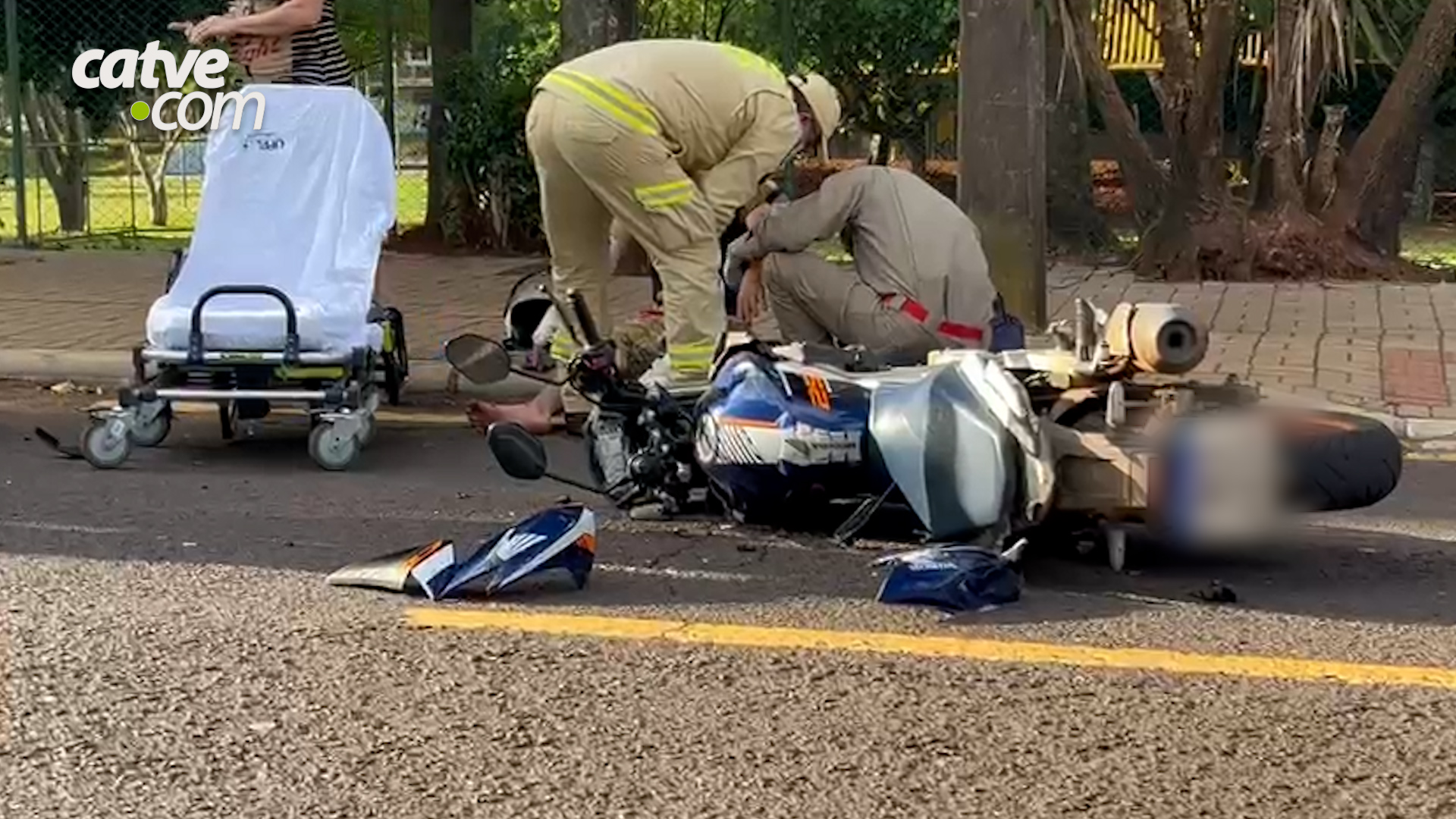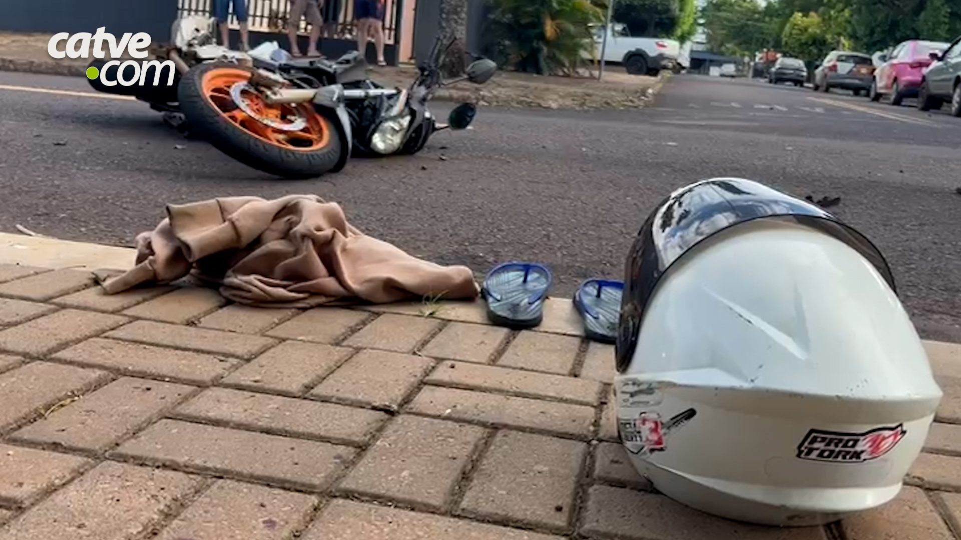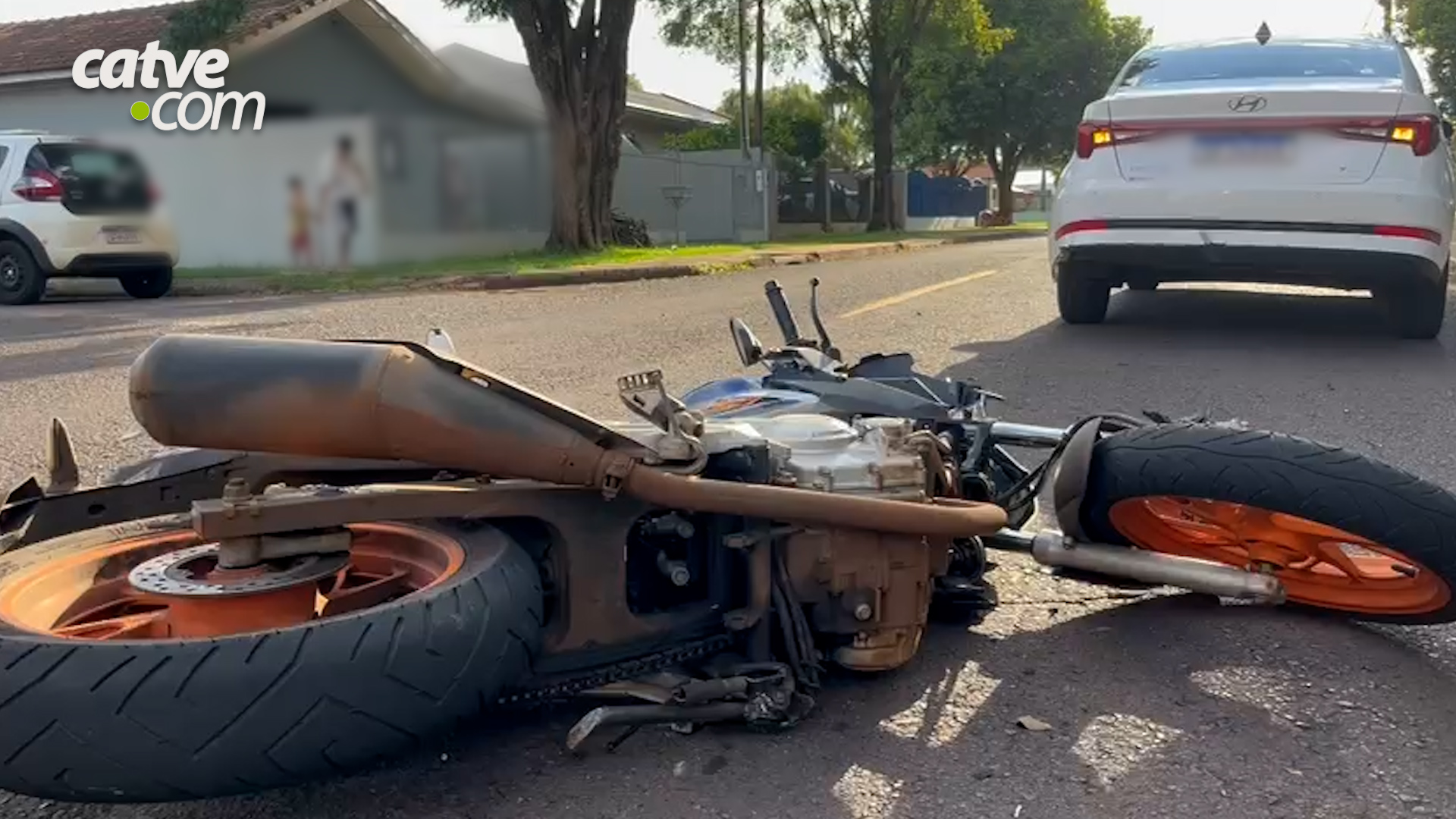 Motociclista de 26 anos ficou ferido após acidente de trânsito registrado na rua Guaiaquis, no bairro Santa Cruz, em Cascavel, na tarde deste domingo (16).