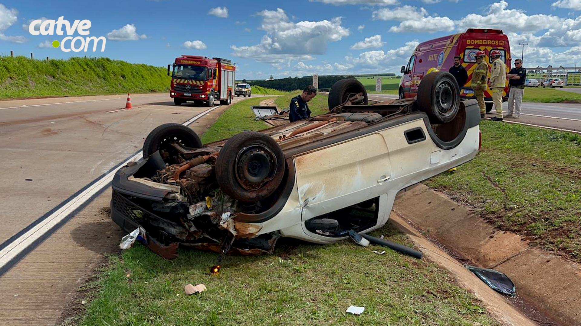 Segundo apurado no local, o veículo seguia sentido Cascavel quando bateu contra barranco e acabou capotando na canaleta de escoamento de água.