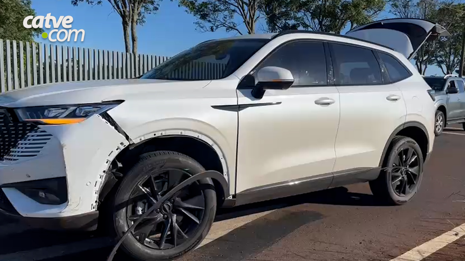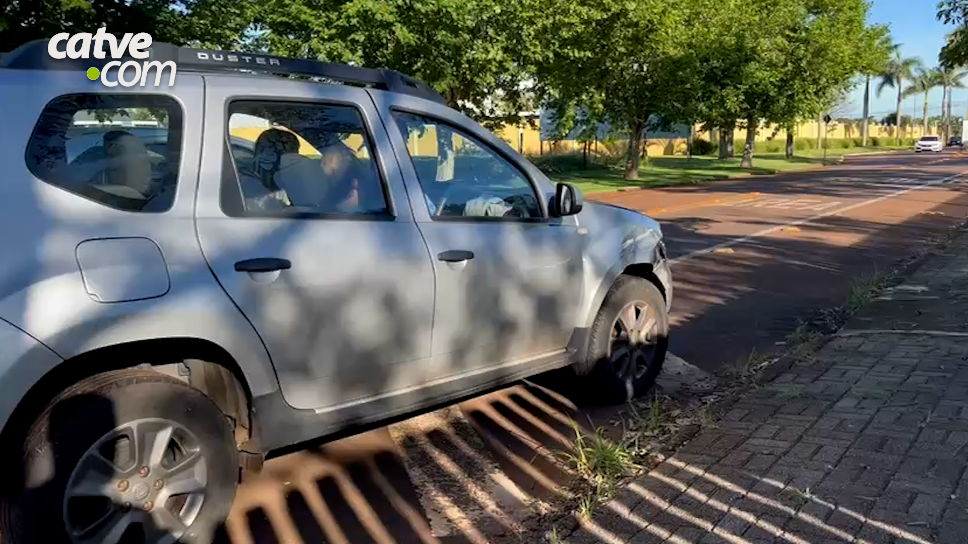 Com a força do impacto, o Duster subiu no canteiro, atravessou e atingiu a Haval que estava aguardando na via.