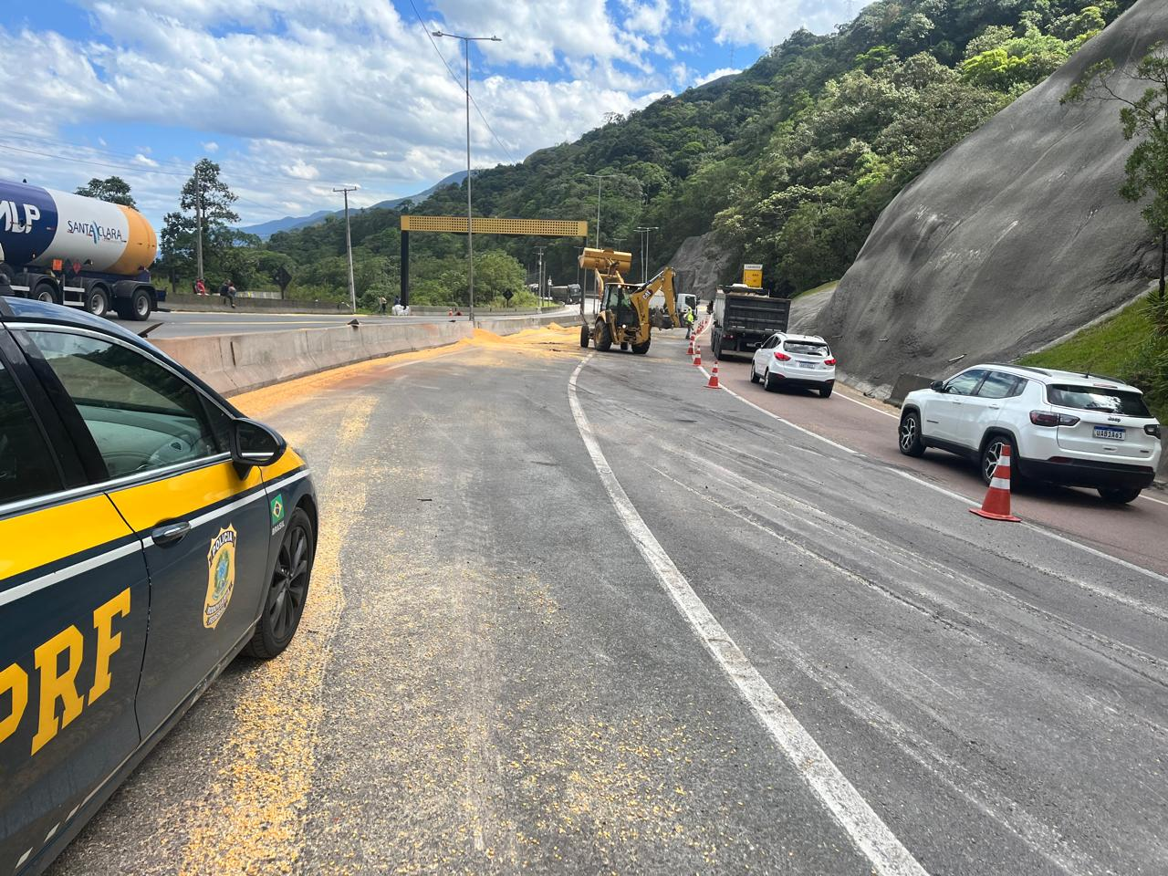 Ainda de acordo com a polícia, a carga de milho ficou espalhada interditando duas pistas sentido a Santa Catarina, que foram liberadas às 15h15. A PRF registrou a ocorrência.
