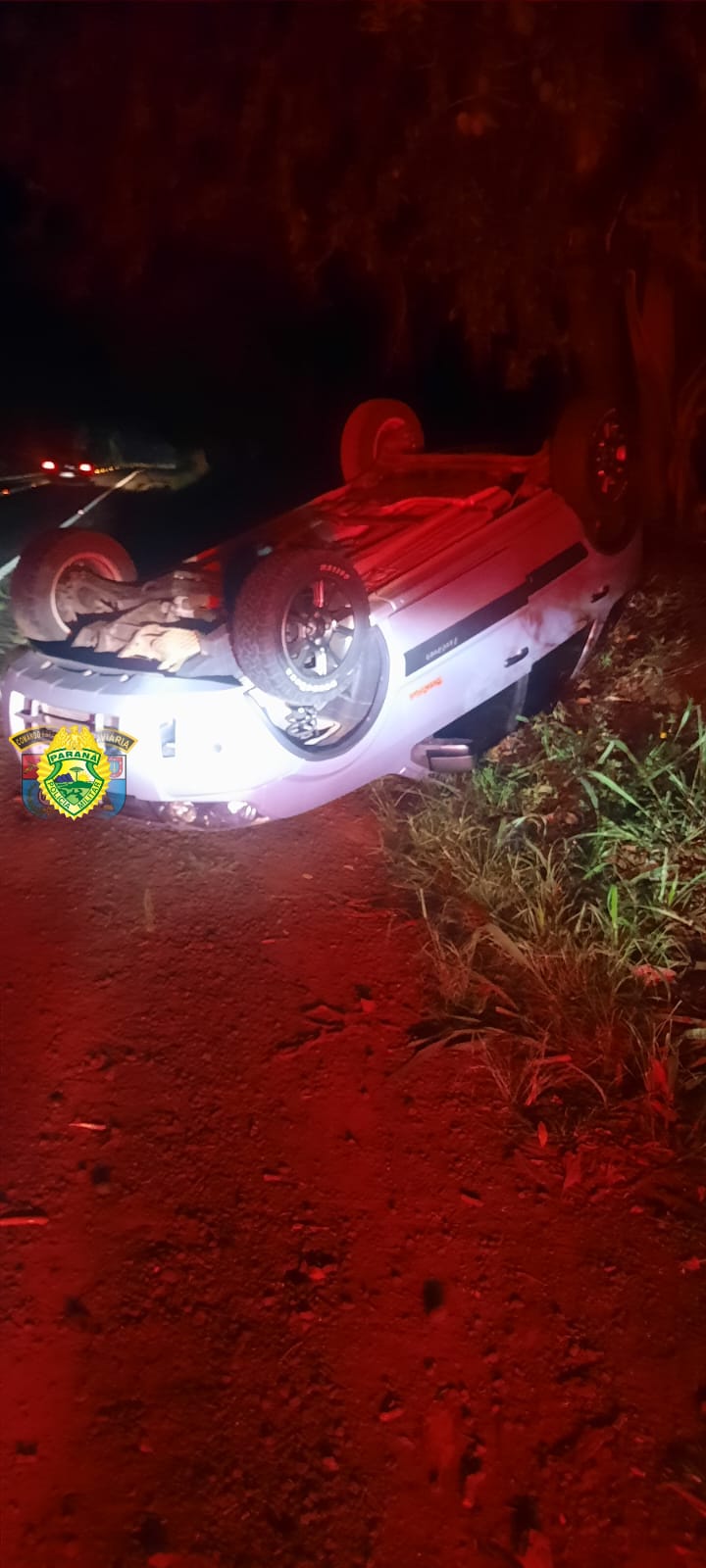Nas imagens é possível ver que o automóvel ficou com as rodas para cima. Outros detalhes não foram repassados.