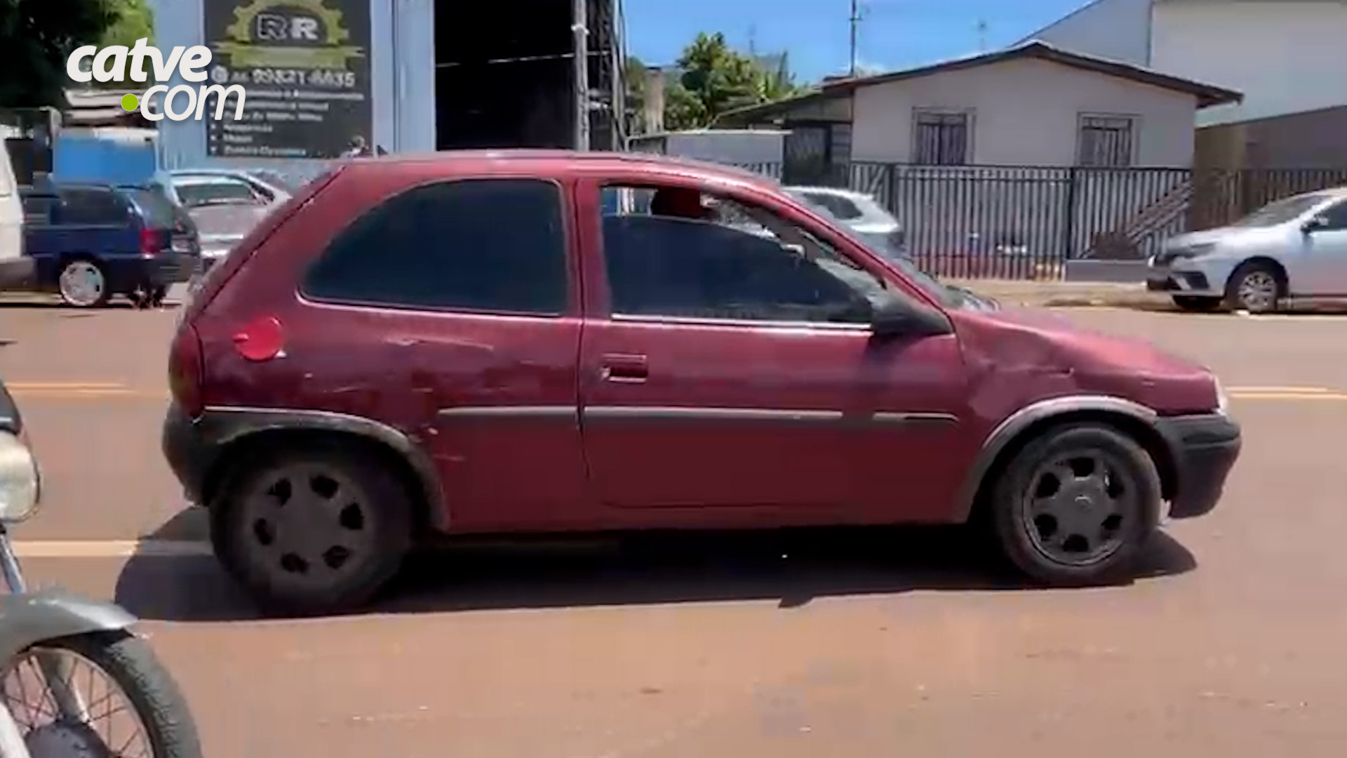 O Catve.com teve acesso ao vídeo de uma câmera de segurança que registrou a batida entre Chevrolet Corsa e Honda Titan no bairro Brasmadeira, em Cascavel, na tarde de quarta-feira (3).