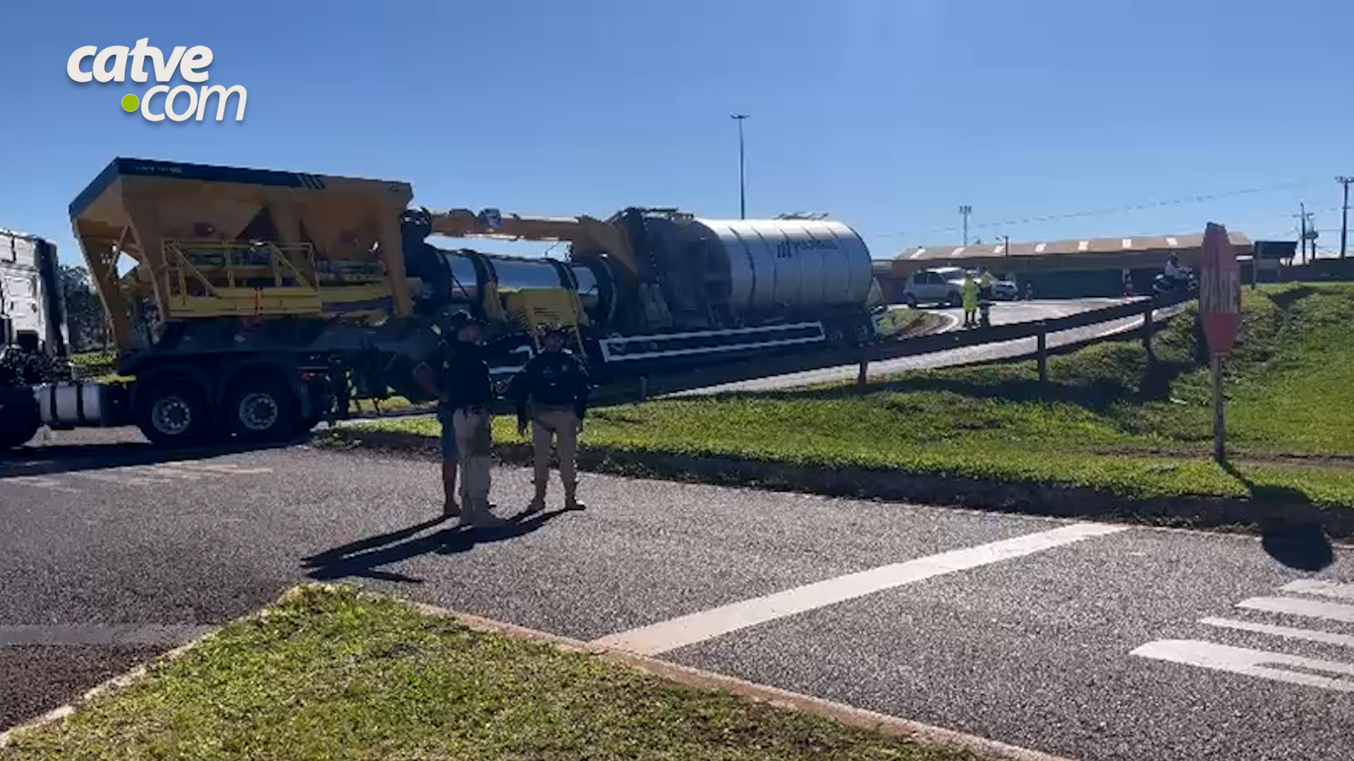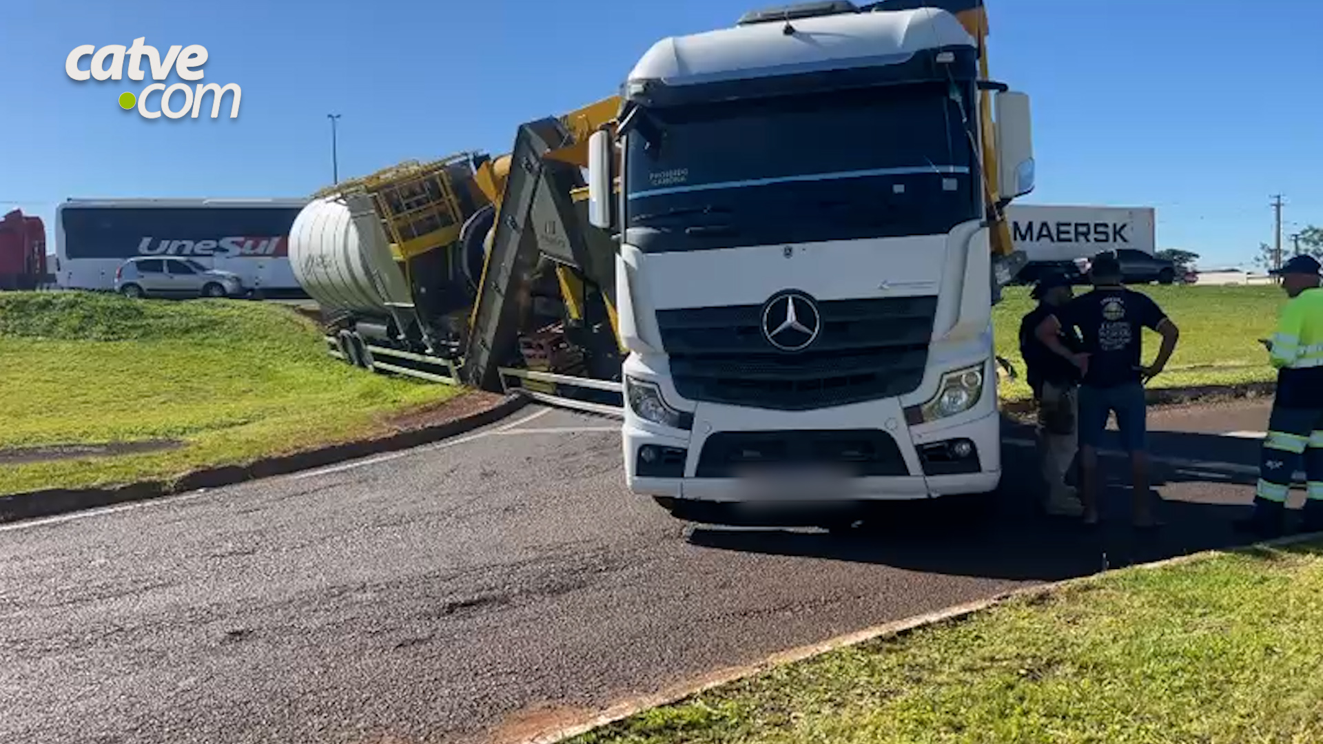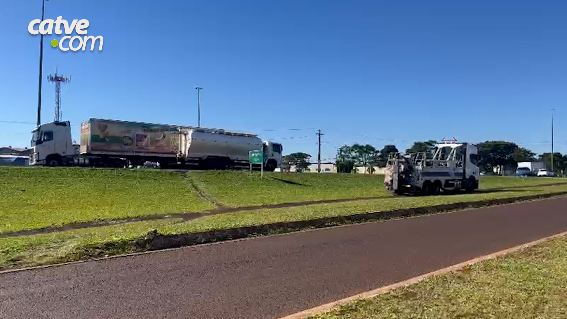 Um caminhão saiu da pista e interditou o trevo do bairro Guarujá em Cascavel, no Oeste do Paraná, nesta manhã de quinta-feira (4).