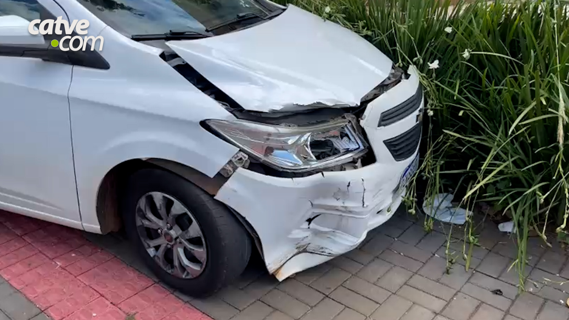Com o impacto, o Onix subiu na calçada e só parou ao encostar em um muro.