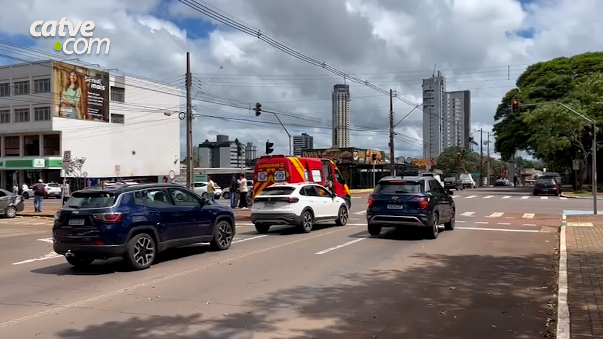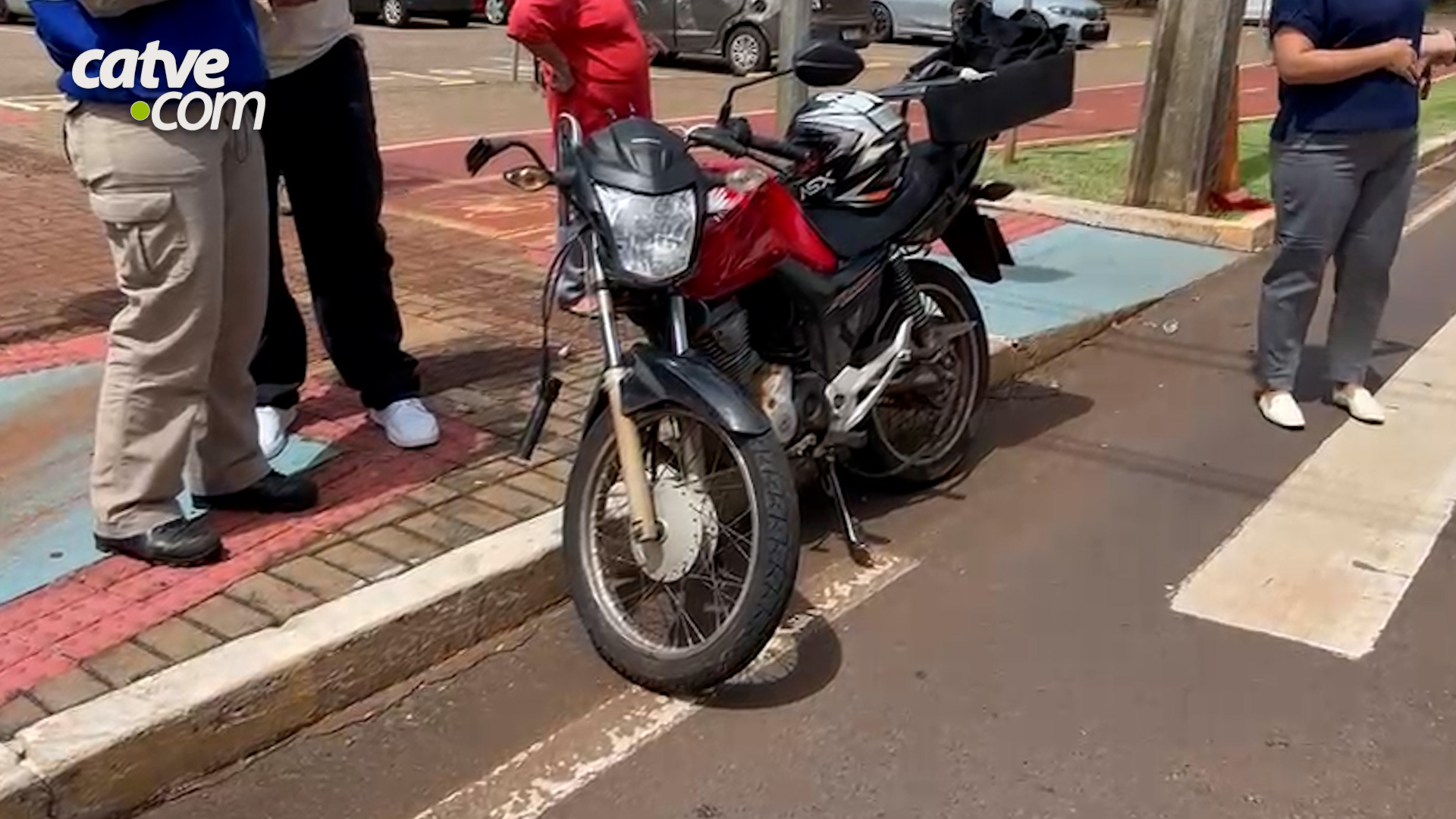 Uma câmera de segurança registrou o acidente envolvendo Ford Ka e Honda CG 160 Start no Centro de Cascavel, na tarde de quarta-feira (10).