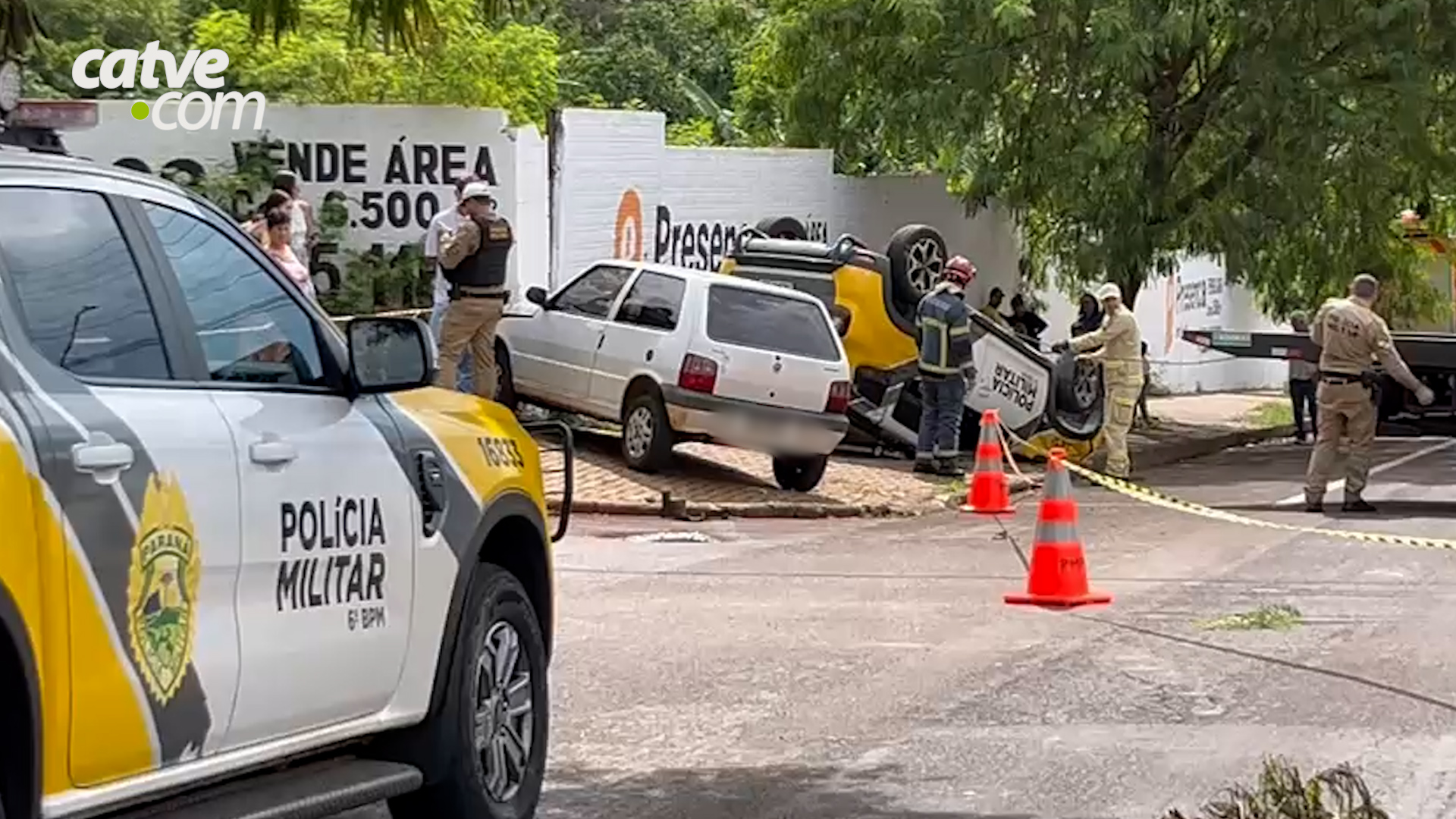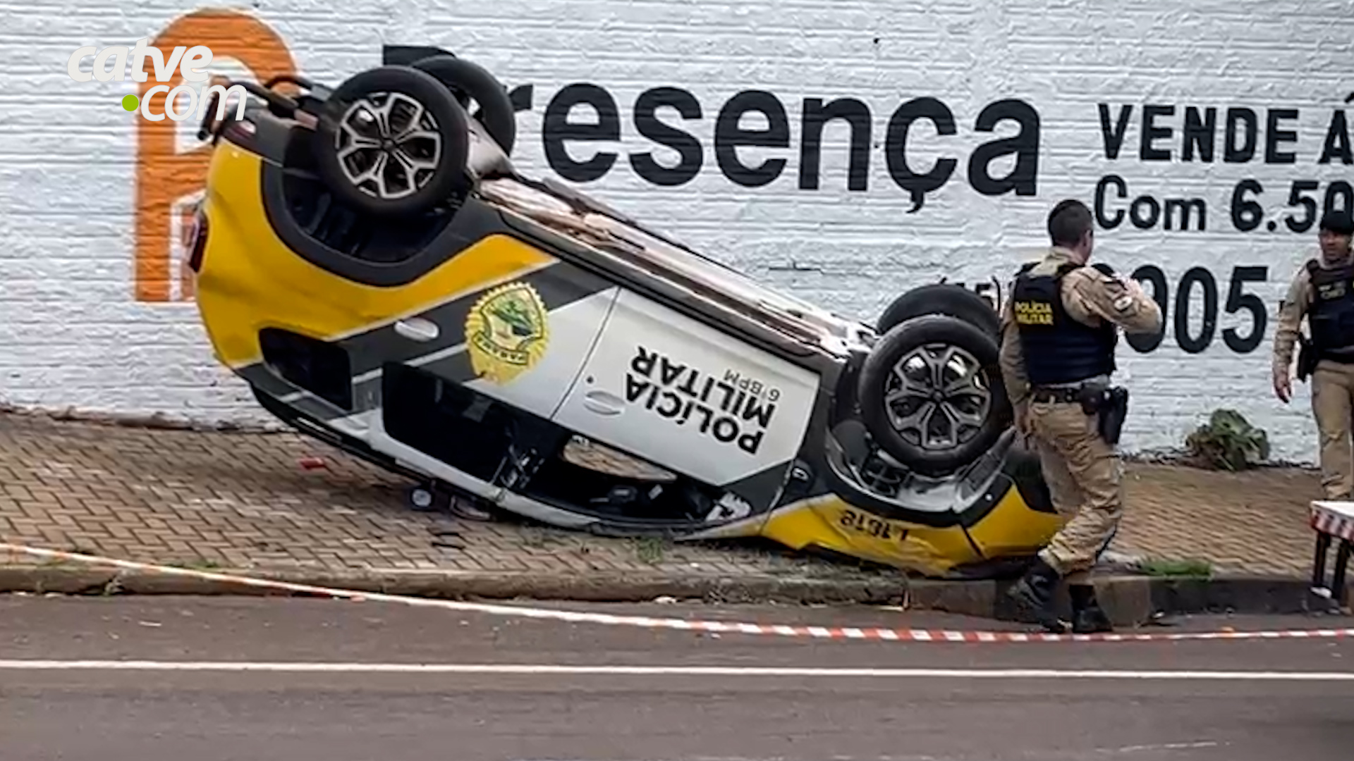 Viatura da Polícia Militar capotou após batida com um carro na tarde deste domingo (14), no cruzamento das ruas Cuiabá e Marechal Deodoro, no bairro Neva, em Cascavel.