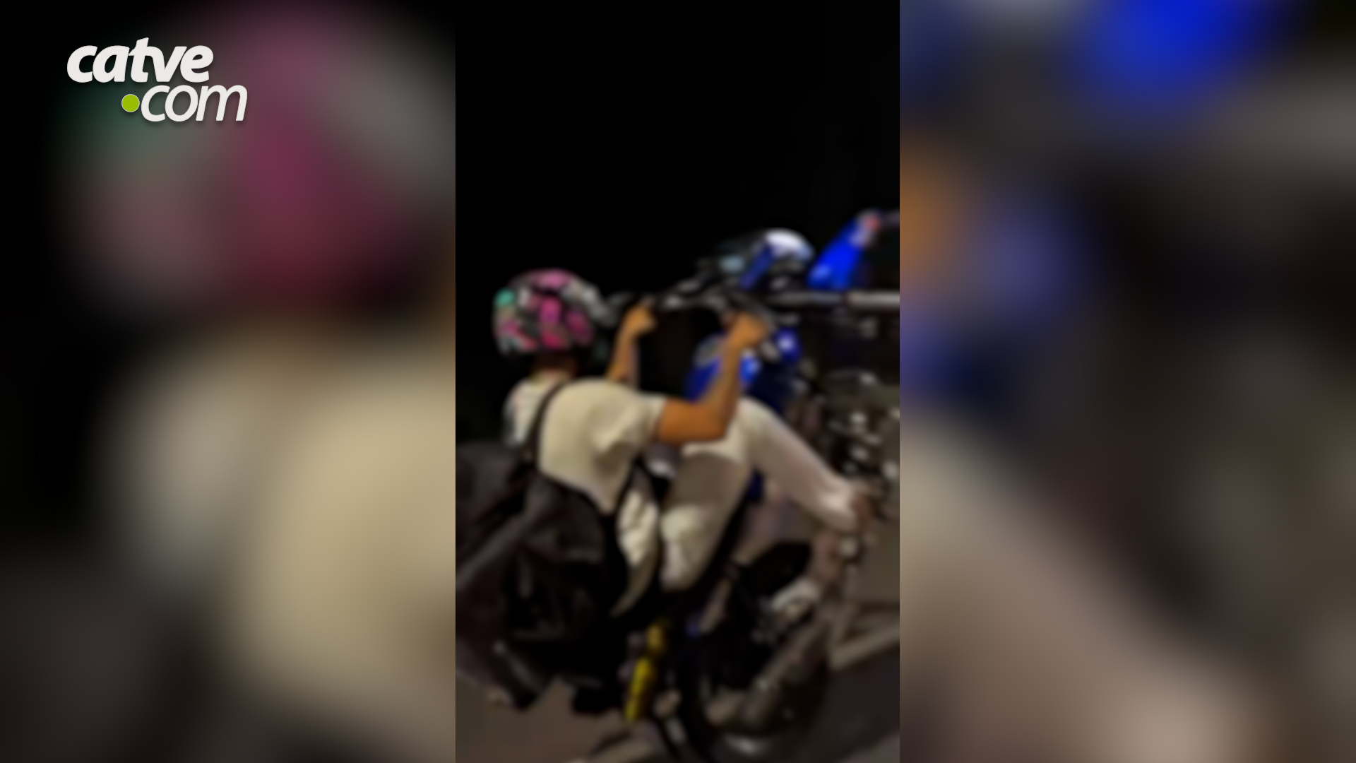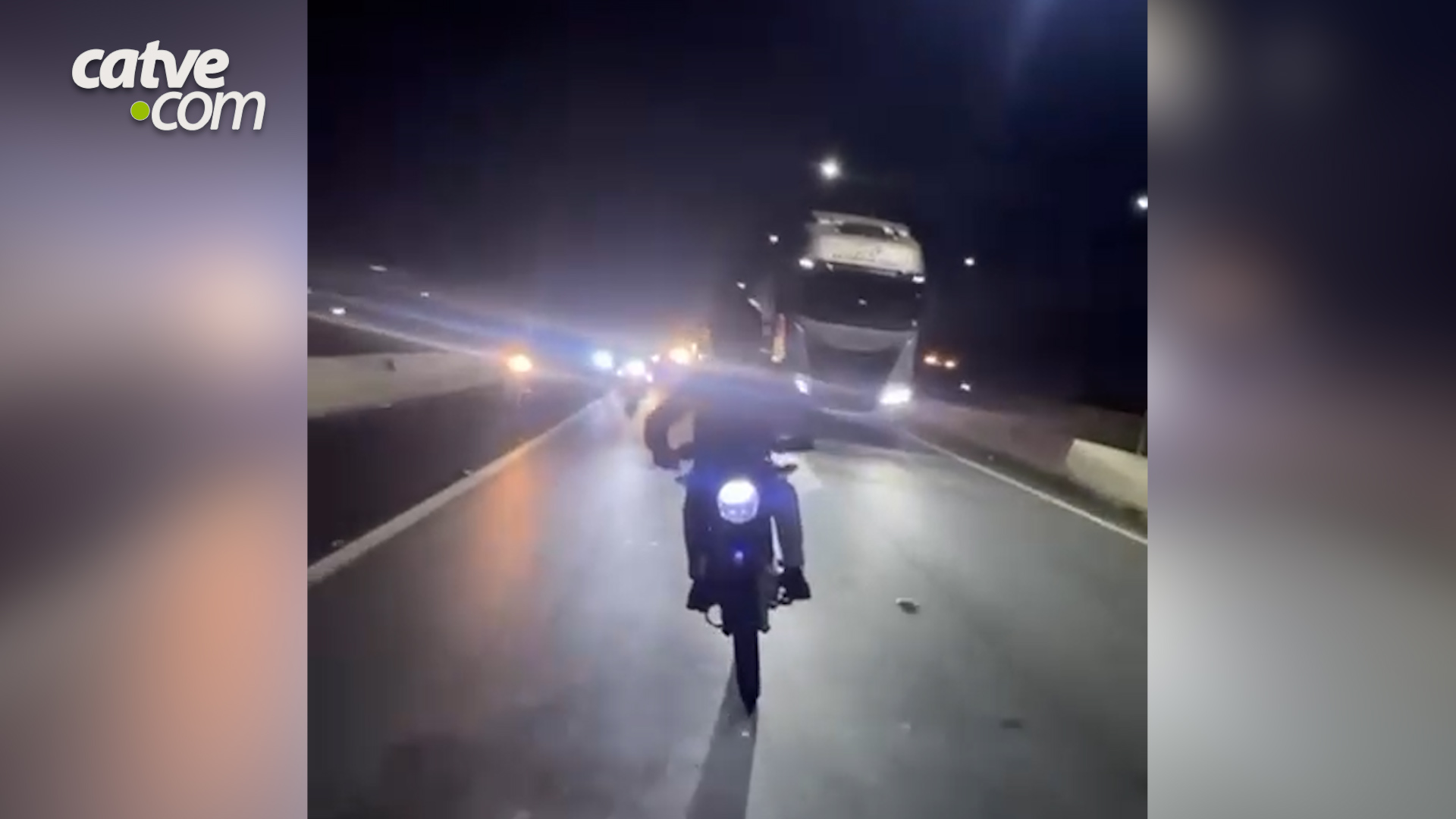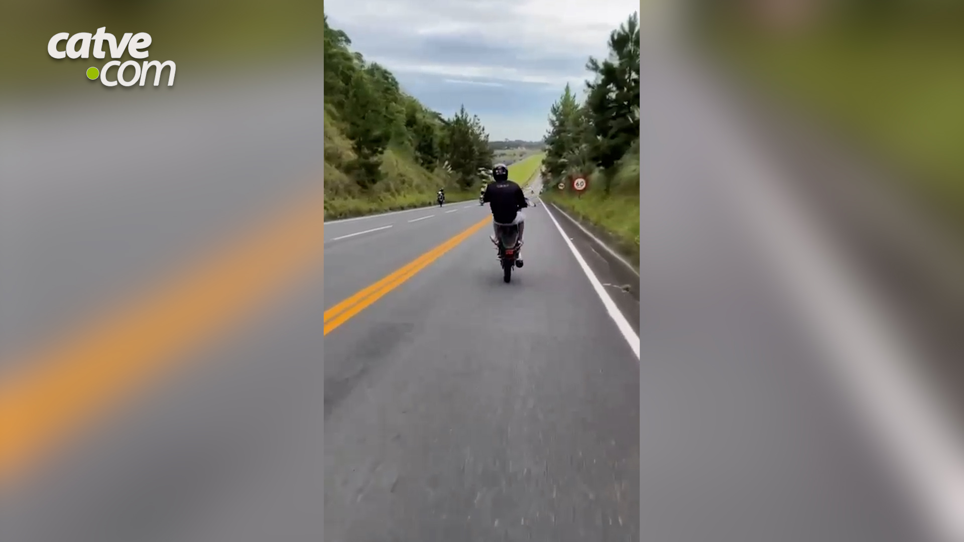 As imagens mostram diferentes situações de risco. Em um dos registros, um homem aparece em pé sobre a motocicleta, apoiado em apenas um dos pés, com a outra perna levantada enquanto o veículo segue em movimento. Em outro vídeo, um motociclista empina a moto em trecho que aparenta ser rodovia, dividindo espaço com outros veículos.