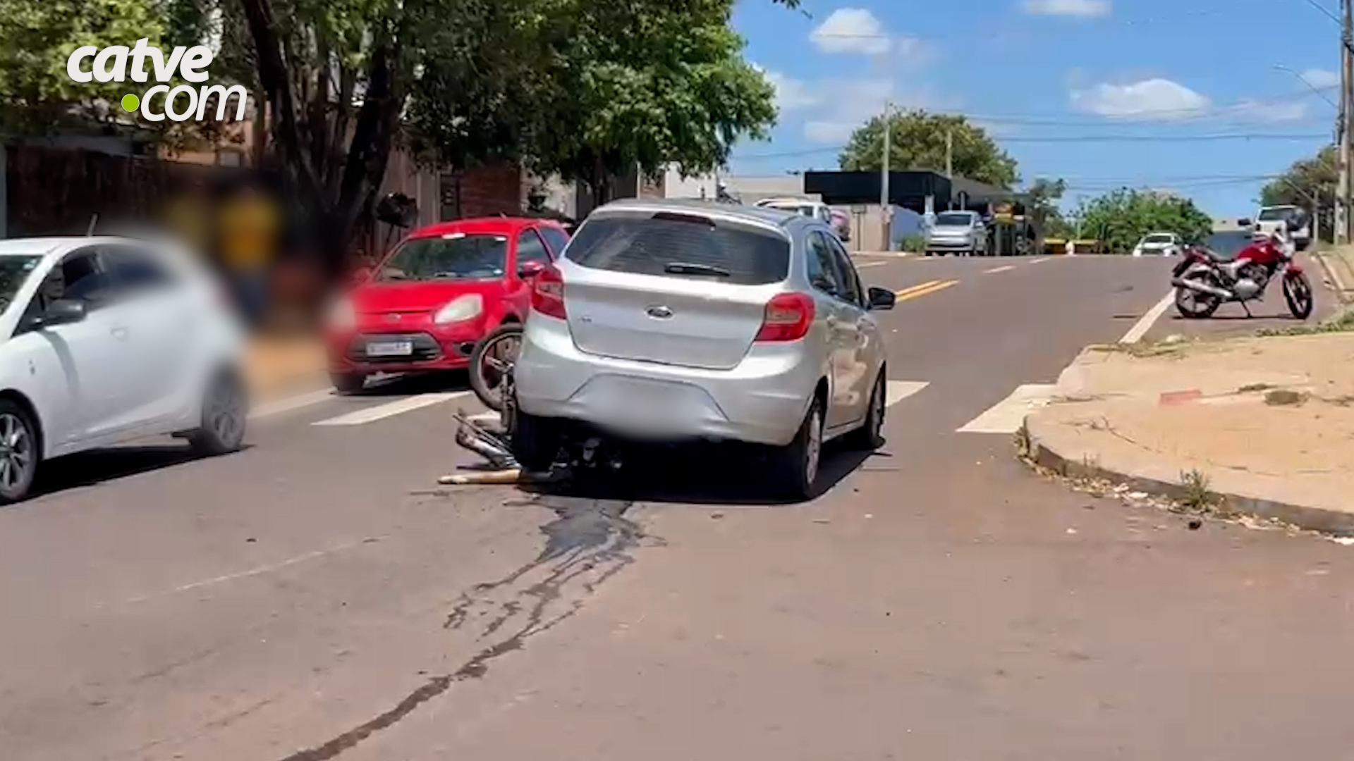 No cruzamento das vias ocorreu a batida e com o impacto, a bicicleta ficou embaixo do carro.