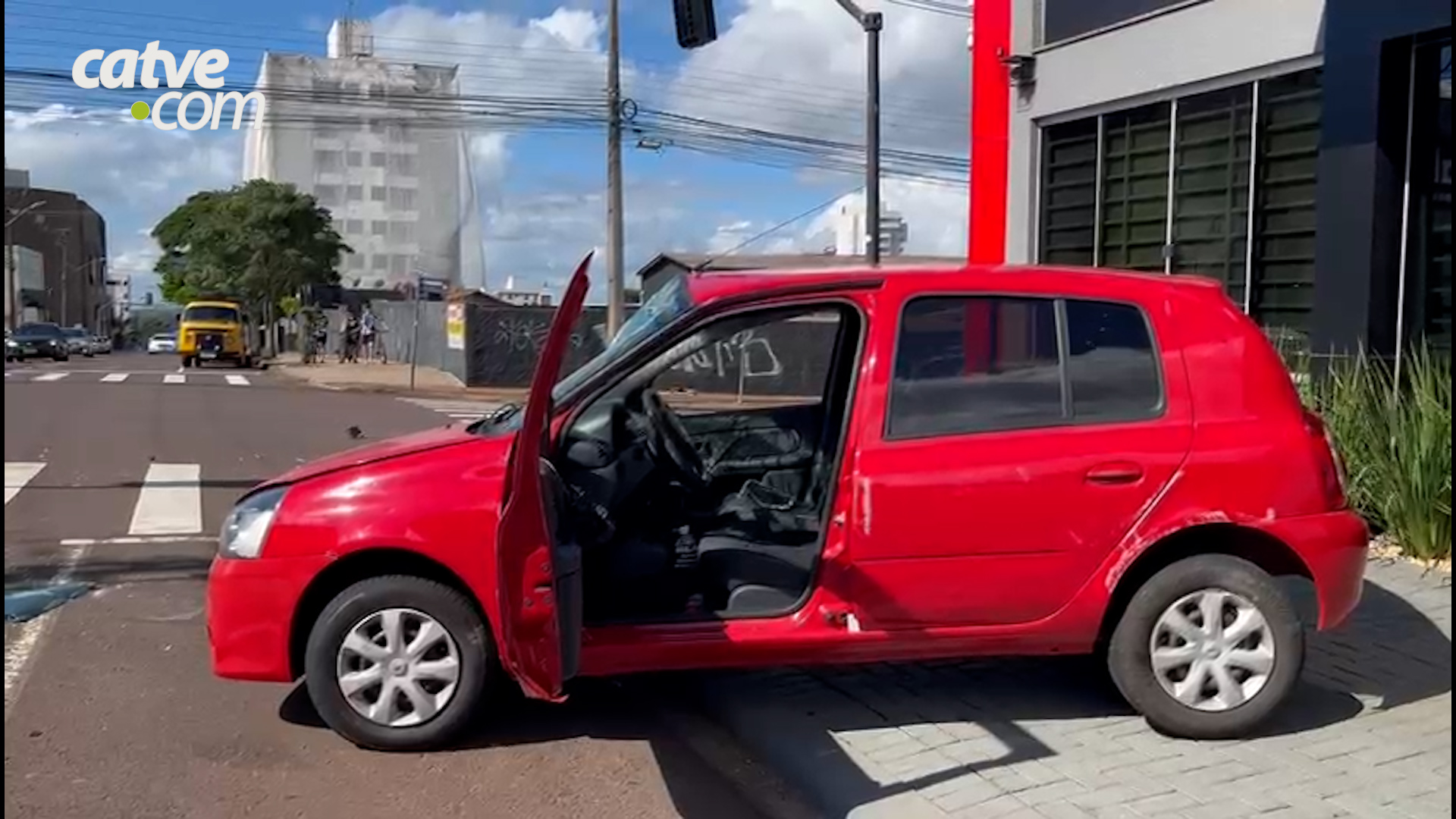 Os dois veículos bateram no cruzamento e com a força da batida, o Renault Clio capotou e, após o movimento, parou na posição normal, com as rodas no chão.
