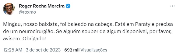 "Mingau, nosso baixista, foi baleado na cabeça. Está em Paraty e precisa de um neurocirurgião. Se alguém souber de algum disponível, por favor, avisem. Obrigado!"