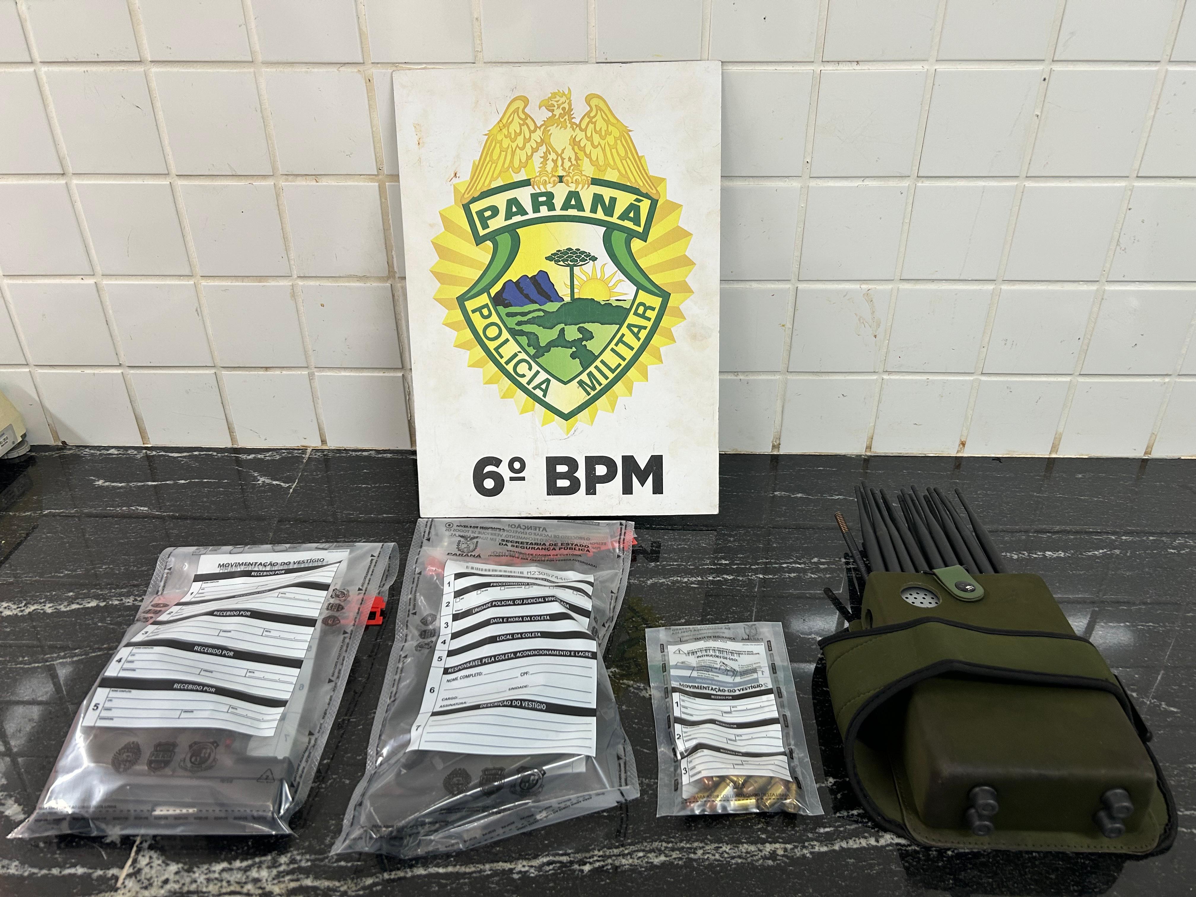 No carro, foram encontradas uma pistola calibre .380 carregada com 15 munições, um simulacro de arma de fogo, um bloqueador de sinal telefônico, três celulares e R$ 99 em dinheiro.
