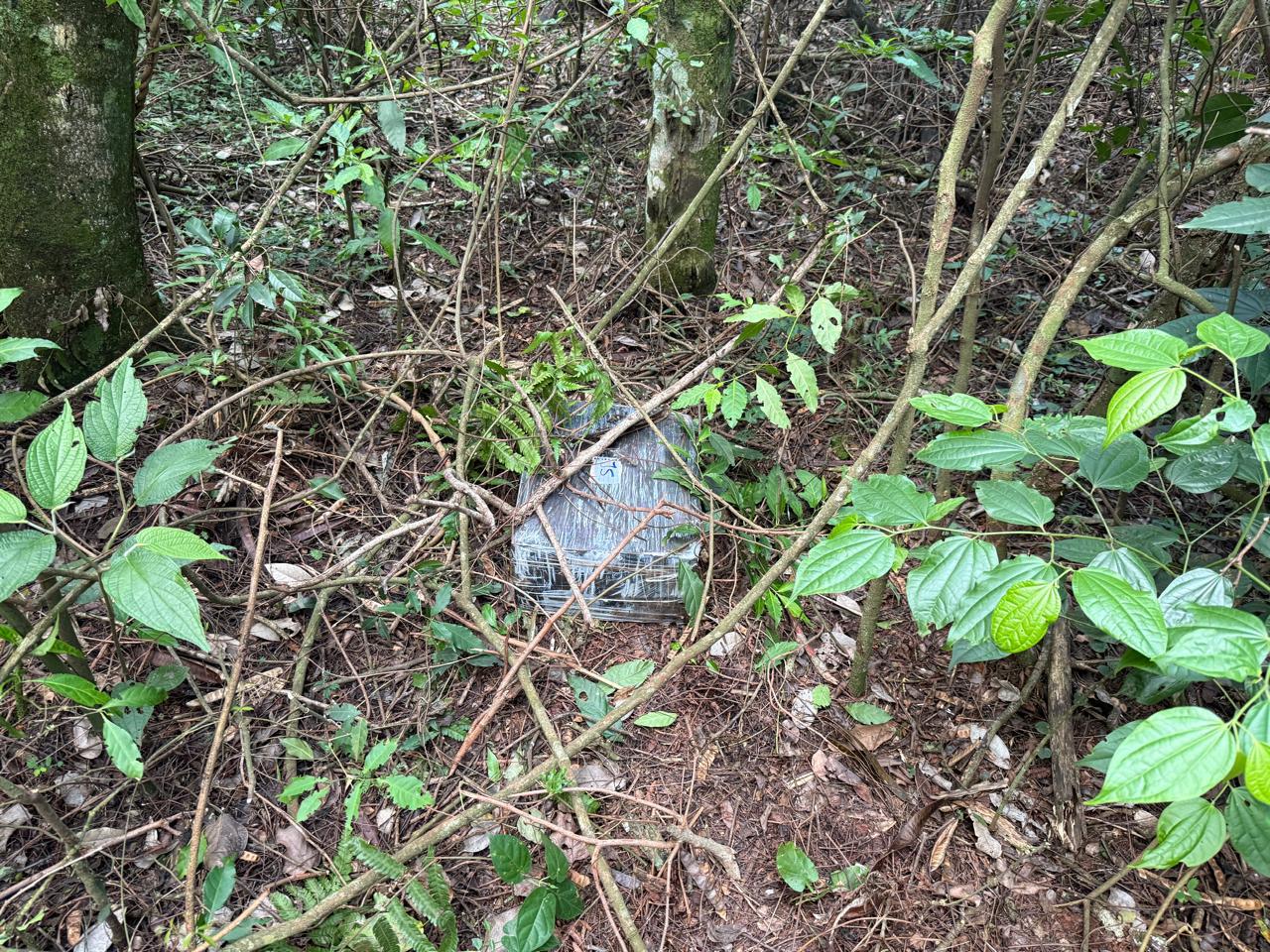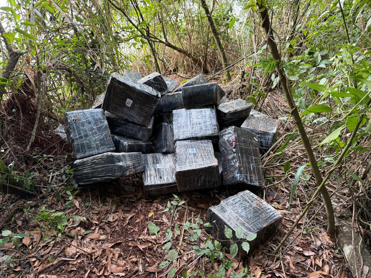 Diante da movimentação, os policiais foram até o local e identificaram uma trilha que ligava a via à margem do lago. Na trilha, localizaram diversos volumes empilhados em meio à mata contendo tabletes de maconha prensada. Também avistaram suspeitos transportando fardos a partir da margem, que fugiram pela mata ao perceber a aproximação policial.