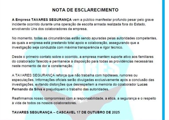 Em nota, a empresa Tavares Segurança, para a qual Lucas trabalhava, lamentou a morte do colaborador e afirmou estar prestando apoio à família. Declarou ainda que acompanha as apurações e que todas as circunstâncias do caso estão sendo investigadas pelas autoridades competentes. A empresa destacou que não trabalha com "hipóteses ou especulações" e que informações oficiais serão divulgadas apenas após a conclusão das investigações, para evitar prejuízo ao trabalho policial e à memória do funcionário.