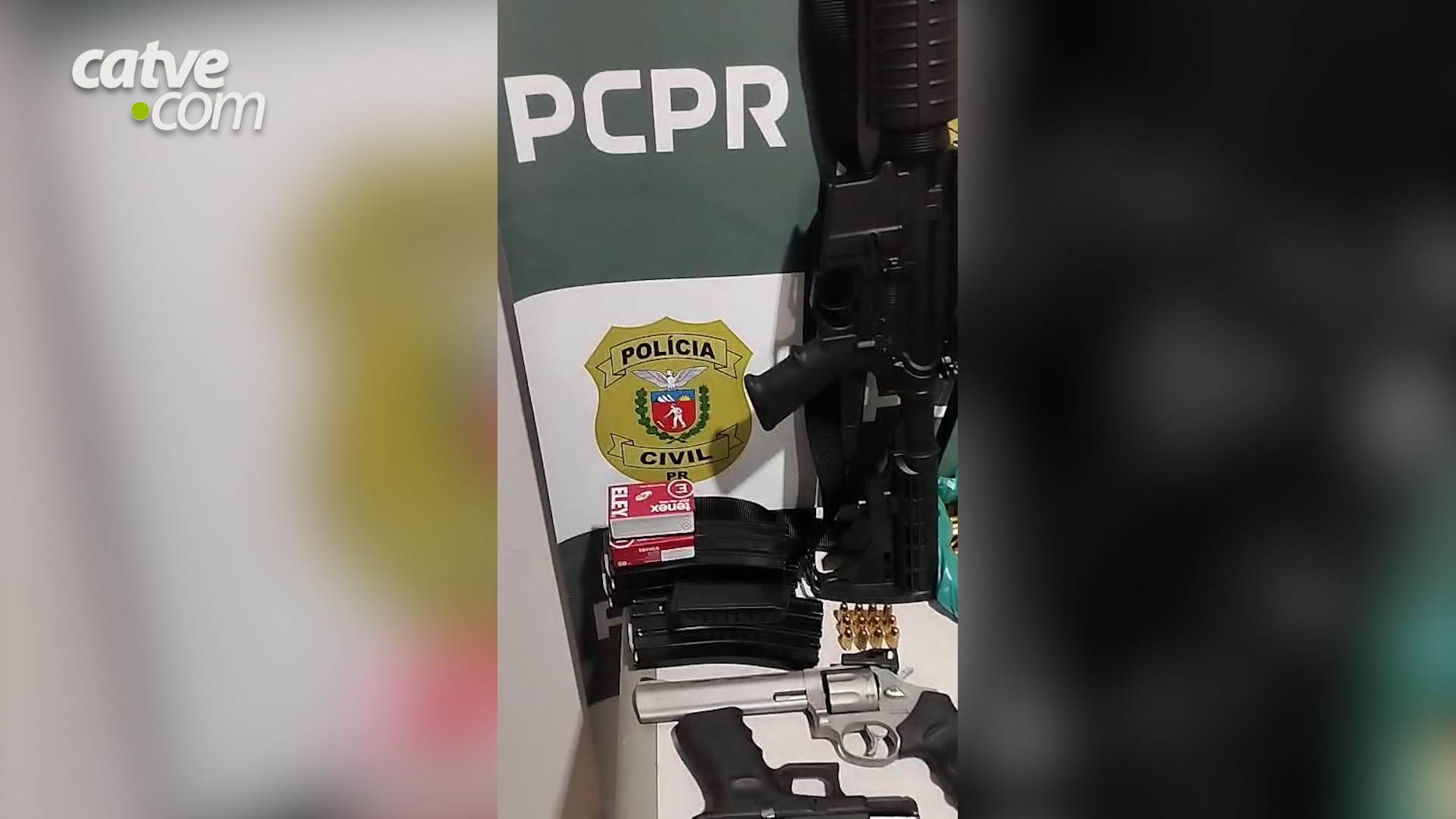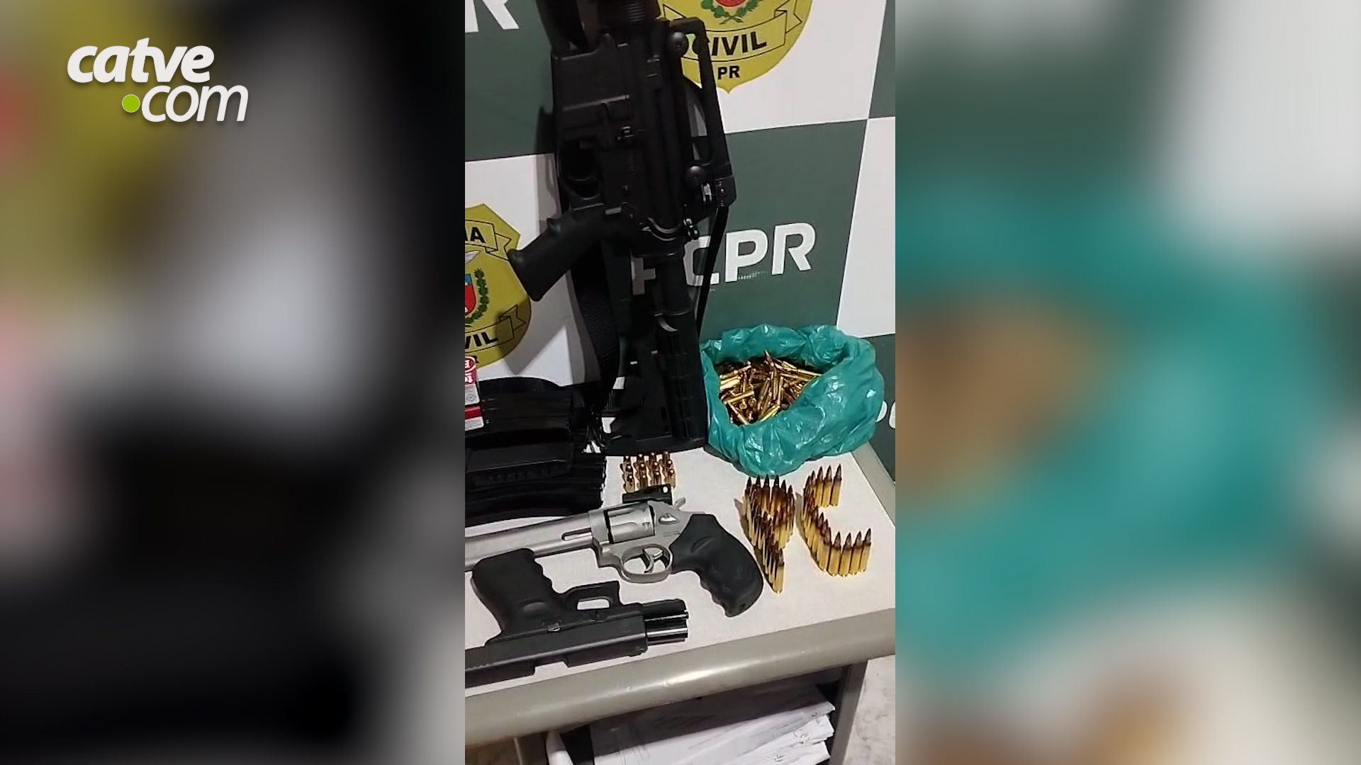 Durante o cumprimento das ordens judiciais, em Cambé, foram apreendidos: fuzil calibre 5,56 - Taurus, revólver calibre .22 - Taurus, pistola Glock .380, 142 munições diversas (.22, .380 e 5,56) e 6 carregadores (1 de pistola e 5 de fuzil)