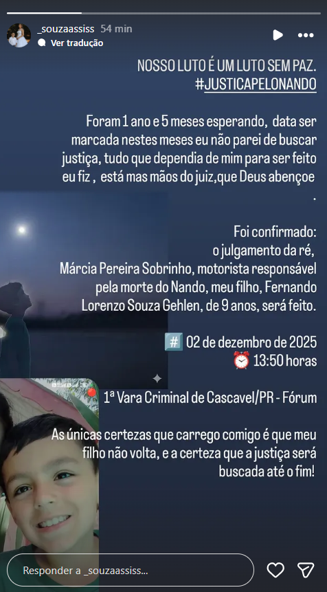 O julgamento da motorista acusada de causar a morte de Fernando Lorenzo, o Nando, de 9 anos, foi marcado para o dia 2 de dezembro, às 13h50, no Fórum de Cascavel. A data foi divulgada nesta quinta-feira (20) pela mãe do menino, nas redes sociais.
