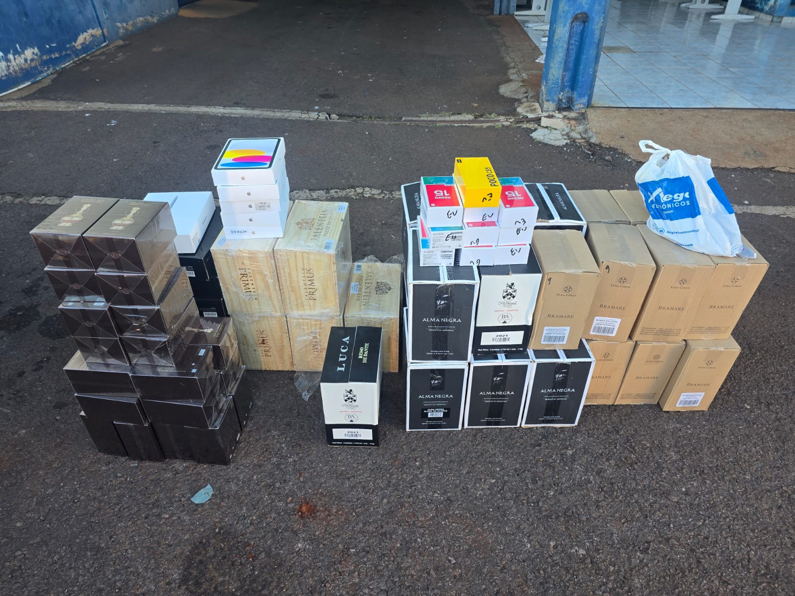 Nos carros foram encontradas diversas caixas de vinhos, perfumes e eletrônicos. Ao todo, foram apreendidos: