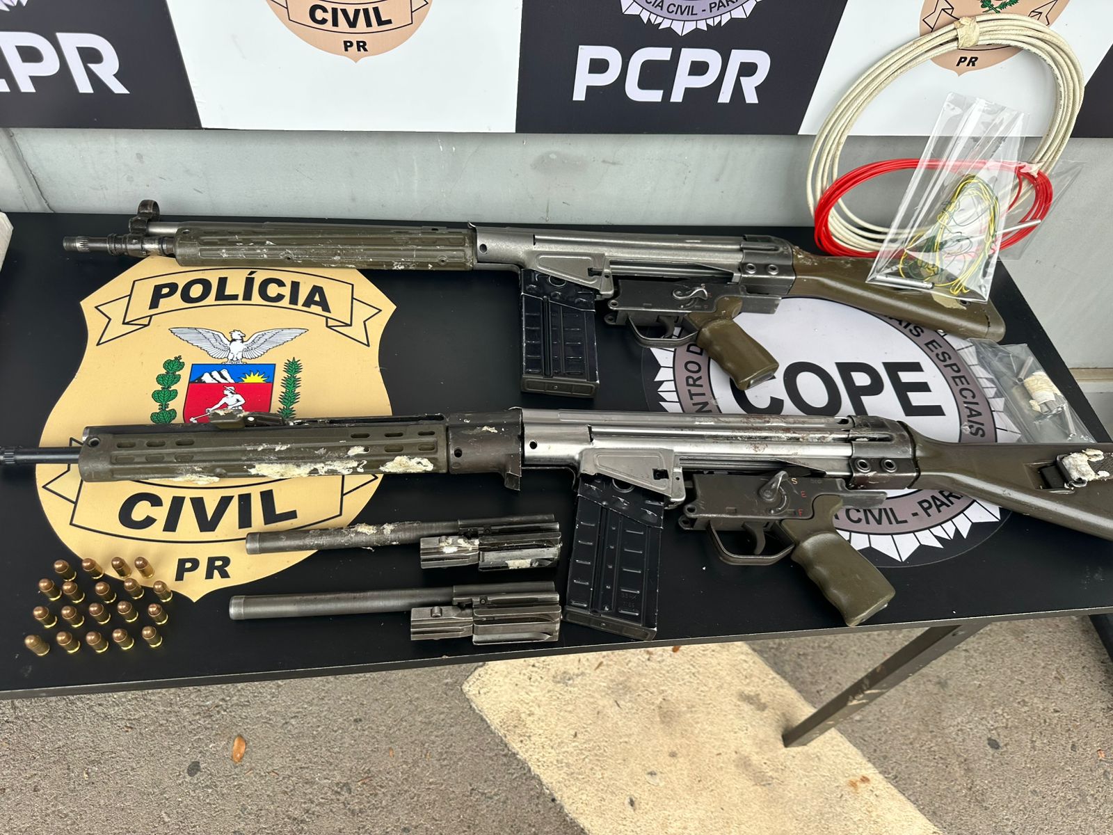 A Polícia Civil do Paraná apreendeu, neste sábado (29), cerca de 30 kg de explosivos e armamentos em uma área de mata na região dos Jardins Holandeses, em Piraquara, na Região Metropolitana de Curitiba.