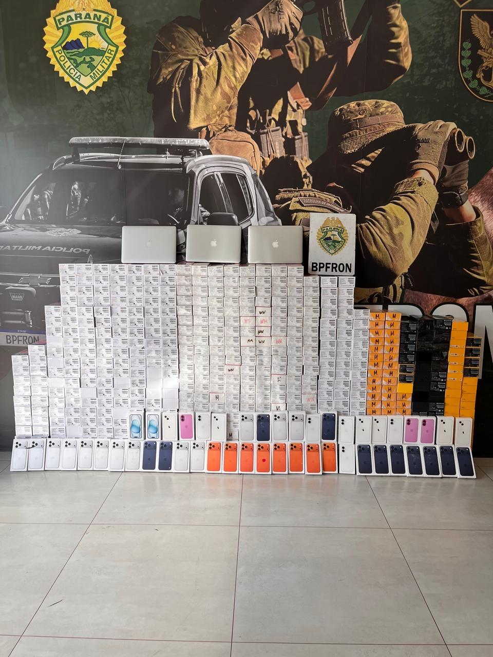 Durante a abordagem, policiais do Batalhão de Polícia de Fronteira (BPFron) localizaram 589 smartphones de diferentes marcas e três computadores MacBook escondidos na cabine e em compartimentos anexos do veículo. Como não havia documentação que comprovasse a importação regular, o caso foi enquadrado como crime de descaminho.