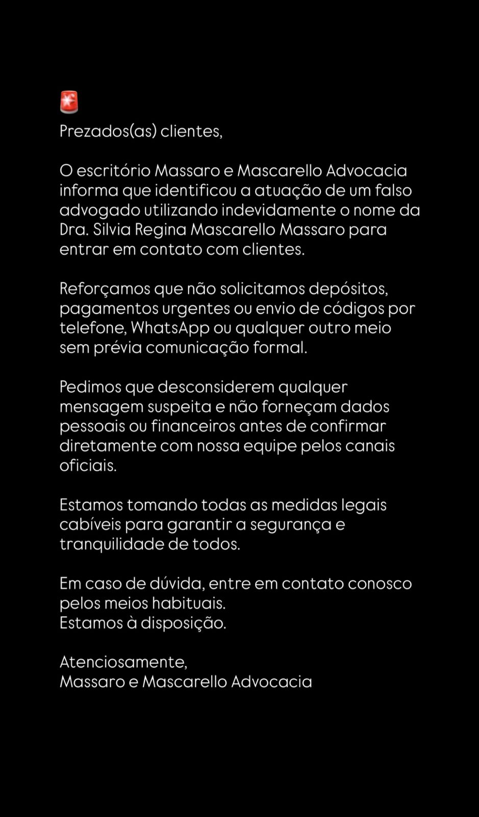 O golpe do falso advogado continua fazendo vítimas, cada dia com o nome de um advogado diferente. A Dra. Silvia usou o perfil pessoal do Instagram para anunciar o golpe, que inclui abordagens pelo Whatsapp solicitando pagamentos urgentes para seguir com processos. Além disso, pedem dados pessoais e envio de códigos.