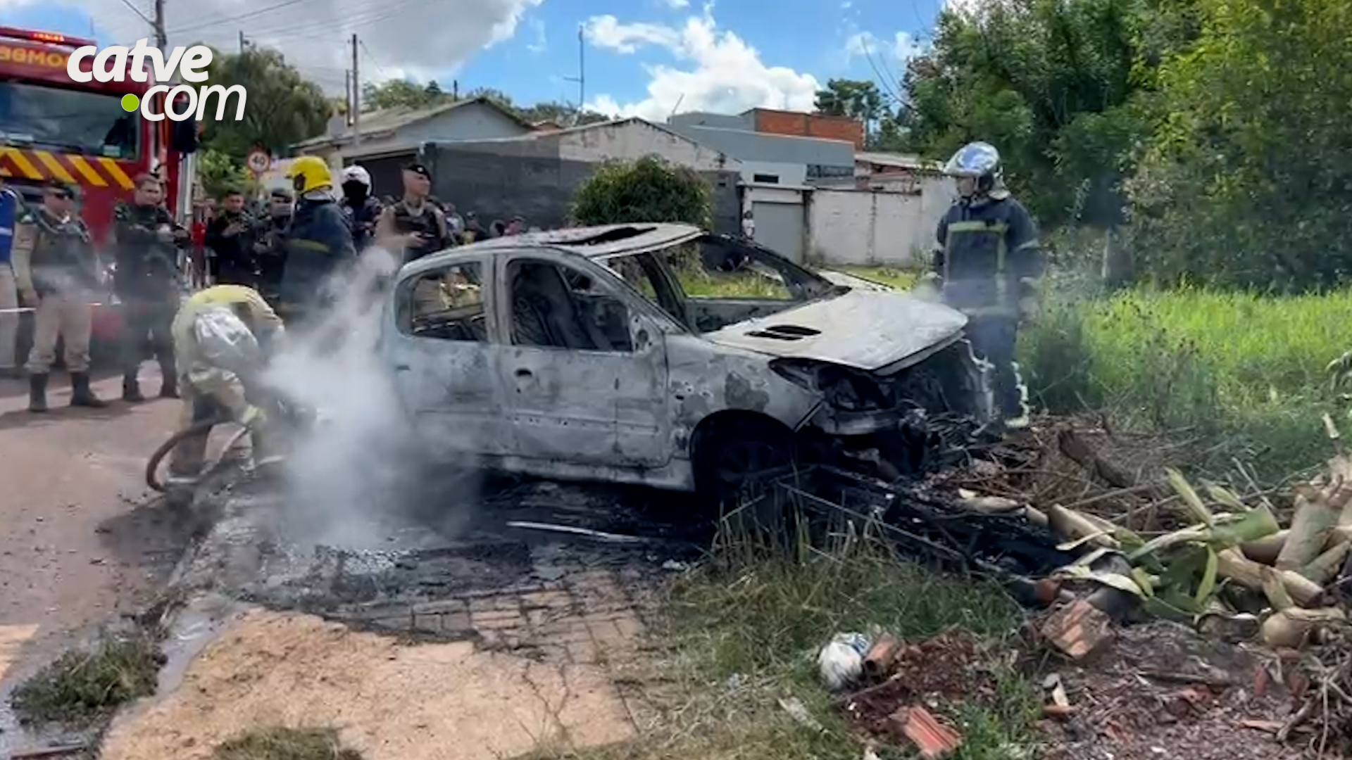 Populares acionaram as equipes de segurança e resgate após perceberem o veículo em chamas na rua Leonardo da Vinci. O carro estava próximo a uma área de mata e bateu contra entulhos, perto do cruzamento com a rua Padre Roque Gonzáles.